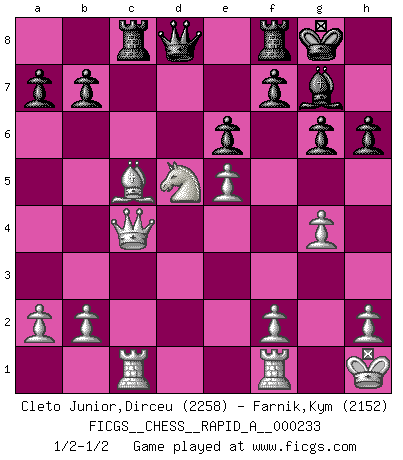 Last move : 1/2-1/2 2019 March 5 14:12:2 [Event "FICGS__CHESS__RAPID_A__000233"] [Site "FICGS"] [Date "2019.02.21"] [Round "1"] [White "Cleto Junior,Dirceu"] [Black "Farnik,Kym"] [Result "1/2-1/2"] [WhiteElo "2258"] [BlackElo "2152"] 1.d4 Nf6 2.c4 g6 3.Nc3 d5 4.Bf4 Bg7 5.Nf3 O-O 6.Rc1 dxc4 7.e4 Bg4 8.Bxc4 Nh5 9.Be3 Bxf3 10.Qxf3 Bxd4 11.O-O c5 12.Kh1 Nc6 13.Bh6 Bg7 14.Bg5 h6 15.Be3 Ne5 16.Qe2 e6 17.g4 Nxc4 18.Qxc4 Nf6 19.e5 Nd5 20.Bxc5 Rc8 21.Nxd5 1/2-1/2 King's Indian defense, 3.Nc3 Kingside Castling by player Black (move 5) Kingside Castling by player White (move 11) This chess game ended in a draw. Follow this game move after move (download)Half the variations which are calculated in a tournament game turn out to be completely superfluous. Unfortunately, no one knows in advance which half. (Jan Tinman) Ein Schachgenie ist jemand der verdammt gut Schach spielt. (Jonathan Levitt) Todo lo que importa ante el tablero de Ajedrez son buenas jugadas. (Bobby Fischer) Pour moi, les échecs ne sont pas un jeu mais un art. (Alexandre Alekhine) The only thing that matters is the evidence. (Horatio Caine, C.S.I. Miami)