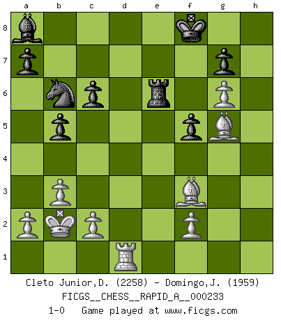 Last move : 1-0 2019 May 21 17:36:22 [Event "FICGS__CHESS__RAPID_A__000233"] [Site "FICGS"] [Date "2019.02.21"] [Round "1"] [White "Cleto Junior,Dirceu"] [Black "Domingo,Jordi"] [Result "1-0"] [WhiteElo "2258"] [BlackElo "1959"] 1.e4 e5 2.Nf3 d6 3.d4 Nf6 4.dxe5 Nxe4 5.Qd5 Nc5 6.Bg5 Be7 7.exd6 Qxd6 8.Nc3 c6 9.Qxd6 Bxd6 10.O-O-O Bc7 11.Be3 Nbd7 12.Nd4 O-O 13.Nf5 Re8 14.Nd6 Bxd6 15.Rxd6 Ne6 16.Be2 Nb6 17.Rhd1 Nc7 18.Rd8 Bf5 19.Rxa8 Rxa8 20.g4 Be6 21.Ne4 Nbd5 22.Bd2 b5 23.Nc5 Re8 24.Bf3 f5 25.g5 Bc8 26.Nd3 Bb7 27.h4 Nb6 28.Nc5 Ba8 29.b3 Ne6 30.Nxe6 Rxe6 31.Be3 Kf7 32.h5 Ke8 33.g6 hxg6 34.hxg6 Ke7 35.Bg5+ Kf8 36.Kb2 1-0 Philidor : Nimzovich, Rellstab variation Queenside Castling by player White (move 10) Kingside Castling by player Black (move 12) Player White won this chess game. Follow this game move after move (download)You have to have the fighting spirit. You have to force moves and take chances. (Bobby Fischer) Die größte Kunst beim Schach besteht darin dem Gegner nicht zu zeigen was er tun kann. (Garry Kasparov) Una victoria por una combinación errónea, aunque sea espectacular, me llena de horror artístico. (Wilhelm Steinitz) Un millionnaire : 'Monsieur Steinitz ! Vous ne participez aux tournois que pour l'argent, alors que moi je n'y viens que pour l'honneur.' Steinitz : 'Chacun joue pour ce qu'il n'a pas'... Beta. Software undergoes beta testing shortly before it's released. Beta is latin for still doesn't work. (Anonymous)