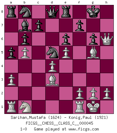 Last move : 1-0 2007 July 10 1:28:45 [Event "FICGS__CHESS__CLASS_C__000045"] [Site "FICGS"] [Date "2007.06.03"] [Round "1"] [White "Sarihan,Mustafa"] [Black "Konig,Paul"] [Result "1-0"] [WhiteElo "1624"] [BlackElo "1921"] 1.d4 d5 2.c4 dxc4 3.e3 Nf6 4.Bxc4 e6 5.Nf3 Be7 6.O-O O-O 7.Qc2 Nc6 8.a3 Na5 9.Bd3 b6 10.e4 Bb7 11.b4 Nc6 12.e5 Nd5 13.Bxh7+ Kh8 14.Bd3 a5 15.b5 Nb8 16.Qe2 g6 17.Qd2 Kg8 18.Qh6 Re8 19.Ng5 Bxg5 20.Bxg5 1-0 Queen's gambit accepted Kingside Castling by player White (move 6) Kingside Castling by player Black (move 6) Player White won this chess game. Follow this game move after move (download)You know you're going to lose. Even when I was ahead I knew I was going to lose. - On playing against Fischer. (Andrew Soltis) Ich moechte nie einem Club beitreten, der Leute wie mich als Mitglieder aufnimmt. (Woody Allen) El Ajedrez es 99 por ciento táctica. (Teichmann) Vous savez, camarade Pachman, je n'éprouve pas de plaisir à être ministre, je jouerais plutôt aux échecs comme vous, ou alors ferais une révolution au Venezuela. (Che Guevara à Ludek Pachman, 'Checkmate in Prague', 1975) I take risks, sometimes patients die, but not taking risks causes more patients to die. So I guess my biggest problem is I've been cursed with the ability to do the math. (Gregory House, House M.D.)