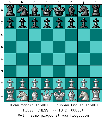 Last move : 0-1 2019 March 24 0:3:2 [Event "FICGS__CHESS__RAPID_C__000204"] [Site "FICGS"] [Date "2019.02.21"] [Round "1"] [White "Alves,Marcio"] [Black "Lounnas,Anouar"] [Result "0-1"] [WhiteElo "1500"] [BlackElo "1500"] 0-1 This chess game has been lost on time (started : 2019.02.21 22:20:13) Player Black won this chess game. Follow this game move after move (download)To avoid losing a piece, many a person has lost the game. (Savielly Tartakover) Ich tröste mich mit dem Vergnügen, daß Schachfans, Zuschauer und Leser glücklich sind, wenn ein Großmeister etwas riskiert, statt nur Klötzchen zu schieben. (Mikhail Nekhemyevich Tal) Las Aperturas te enseñan aperturas. ¡Los Finales te enseñan Ajedrez!. (Stephan Gerzadowicz) C'est une question de caractère, Beaucoup de gens perdent leur motivation très vite. D'autres, ils sont rares, peuvent la conserver très longtemps. J'aime les échecs, encore aujourd'hui je suis heureux d'analyser des parties. J'aime toujours gagner, je déteste encore perdre. Bien jouer est important pour mon intégrité intellectuelle et morale. Et puis les échecs vivent en ce moment une période historique grâce à Internet. Ils se développent dans les systèmes éducatifs à travers le monde. Ils sortent de leur ghetto, et c'est mon rôle de mener à bien cette révolution. (Gary Kasparov) Rules and bones are meant to be broken. (Anonymous)