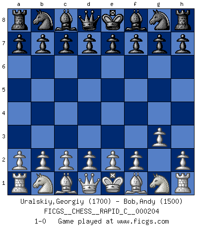 Last move : 1-0 2019 March 25 12:23:5 [Event "FICGS__CHESS__RAPID_C__000204"] [Site "FICGS"] [Date "2019.02.21"] [Round "1"] [White "Uralskiy,Georgiy"] [Black "Bob,Andy"] [Result "1-0"] [WhiteElo "1700"] [BlackElo "1500"] 1.g3 1-0 This chess game has been lost on time (started : 2019.02.21 22:20:13) Benko's Opening Player White won this chess game. Follow this game move after move (download)By playing at Chess then, we may learn: First: Foresight... Second: Circumspection... Third: Caution... And lastly, we learn by Chess the habit of not being discouraged by present bad appearances in the state of our affairs, the habit of hoping for a favorable chance, and that of persevering in the secrets of resources. (Benjamin Franklin) Die Partien sind immer verschieden, die Interviews immer die gleichen. (Garry Kasparov) Me siento como si fuera una pieza en una partida de Ajedrez, cuando mi oponente me indica: esa pieza no puede ser movida. (Soren Kierkegaard) Les ravages du H expliquent la différence de niveau entre Tal et Thal [Abergel]. The message for business people contemplating their place in the cyberspace is simple and direct: get linked or get lost. (Vic Sussman and Kenan Pollack)