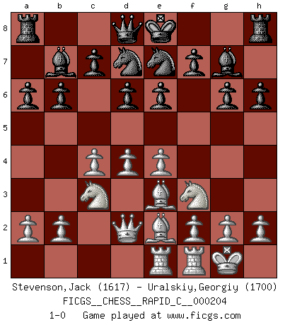 Last move : 1-0 2019 May 5 19:26:47 [Event "FICGS__CHESS__RAPID_C__000204"] [Site "FICGS"] [Date "2019.02.21"] [Round "1"] [White "Stevenson,Jack"] [Black "Uralskiy,Georgiy"] [Result "1-0"] [WhiteElo "1617"] [BlackElo "1700"] 1.e4 g6 2.d4 Bg7 3.c4 d6 4.Nc3 a6 5.Nf3 Nd7 6.Be3 b6 7.Be2 Bb7 8.O-O e6 9.Qd2 Ne7 10.Rad1 h6 11.Rde1 1-0 This chess game has been lost on time (started : 2019.02.21 22:20:13) Robatsch (Modern) defense Kingside Castling by player White (move 8) Player White won this chess game. Follow this game move after move (download)What would Chess be without silly mistakes ? (Kurt Richter) Ich verstehe mehr vom Schach als irgendein anderer lebender Meister. (José Raúl Capablanca) Ciertamente el estado mental actual de Bobby Fischer es una tragedia. Uno de los mas grandes jugadores de Ajedrez del mundo -el orgullo y pena del Ajedrez Americano. (Frank Brady) La tactique est l'élément le plus important du milieu de jeu. (Siegbert Tarrasch) What doesn't kill us makes us stronger. (Friedrich Nietzsche)