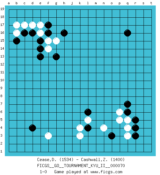 Last move : 1-0 2019 June 1 20:46:48 [Event "FICGS__GO__TOURNAMENT_KYU_II__000070 "] [Site "FICGS"] [Date "2019.02.22"] [Round "1"] [Black "Cease,Dion "] [White "Cashwall,Zoomerhimmer "] [Result "1-0"] [Rating 1 "1534"] [Rating 2 "1400"] 1.q16 c17 2.d4 q4 3.o3 k3 4.q6 p5 5.r3 q3 6.r4 q5 7.r5 p6 8.q7 f3 9.l4 k4 10.l6 n4 11.d16 d17 12.f16 l5 13.c16 e16 14.e15 e17 15.f17 f15 16.e14 g15 17.h16 b16 18.b15 b17 19.g13 f14 20.e13 1-0 Here are the names of the openings (joseki) played in the four corners : Corner q4 : q4 o3Hoshi (Hwajeom, Seongjeom, Xingwei`) 4-4 Point. The star or hoshi (4-4) point, emphasizing influence at the potential expense of territory.Ikken Kakari (Hankan Keolch'im, Yi Gua`jiao~, 1-Space Low Approach). Black 2 is the standard approach move to the 4-4. Corner d4 : d4 f3Hoshi (Hwajeom, Seongjeom, Xingwei`) 4-4 Point. The star or hoshi (4-4) point, emphasizing influence at the potential expense of territory.Ikken Kakari (Hankan Keolch'im, Yi Gua`jiao~, 1-Space Low Approach). White 2 is the standard approach move to the 4-4. Corner d16 : c17 d16San-San (Sam-Sam, San-San) 3-3 Point. The San-San (3-3) point, emphasizing territory at the expense of influence.Kata-tsuki (shoulder hit). The shoulder-hit is the traditional answer to the 3-3. The direction of White 3 depends on the positions on the side. Crawling once may be the premise for a follow-up move of sliding with a knight's move in the opposite direction. If White plays 3 at 3-4 (to the right), the follow-on knight's move is then played at the top (e.g. 3-4, 4-5, 5-2). White's knight's move reduces territory potential on the side it is played. Player Black won this Go (weiqi, baduk) game.Follow this game move after move (download ) On the third line, four die, six live. (Anonymous) A computer lets you make more mistakes faster than any invention in human history - with the possible exceptions of handguns and tequila. (Mitch Ratcliffe)