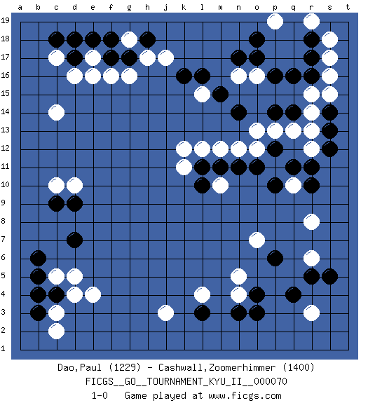 Last move : 1-0 2019 June 1 10:49:33 [Event "FICGS__GO__TOURNAMENT_KYU_II__000070 "] [Site "FICGS"] [Date "2019.02.22"] [Round "1"] [Black "Dao,Paul "] [White "Cashwall,Zoomerhimmer "] [Result "1-0"] [Rating 1 "1229"] [Rating 2 "1400"] 1.q4 d16 2.c4 e4 3.q16 c5 4.b5 d5 5.b6 c3 6.b3 d4 7.b4 c2 8.c9 j3 9.f17 c14 10.k16 r6 11.o3 r14 12.r10 o16 13.q14 q13 14.p14 r15 15.p16 s17 16.s12 r12 17.s13 r13 18.r17 s18 19.r11 o12 20.n14 r8 21.r16 s16 22.s14 s15 23.p10 m12 24.r5 o7 25.n11 n12 26.m15 p19 27.r18 r19 28.o18 m10 29.p12 p13 30.o11 o13 31.m11 l12 32.l11 l15 33.l16 k12 34.d17 c17 35.c18 e17 36.d18 e16 37.e18 k11 38.l10 f16 39.g17 c10 40.d9 d10 41.d7 g16 42.l3 n16 43.o17 h17 44.h18 g18 45.f18 j17 46.n17 r3 47.s5 n4 48.o4 n5 49.n3 l4 50.p6 q10 51.q11 1-0 This go game has been lost on time (started : 2019.02.22 23:3:7) Here are the names of the openings (joseki) played in the four corners : Corner d4 : c4 e4Komoku (Somok, Xiao~mu`) 3-4 Point. The komoku (3-4) point is the traditional corner enclosure move..Ikken Takagakari (Hankan Nop'dakeolch'im, Yi Gaogua`jiao~, 1-Space High Approach). The 5-4 approach move has become more popular in modern times, as modern Go emphasizes speed and influence. Corner d16 : d16 f17Hoshi (Hwajeom, Seongjeom, Xingwei`) 4-4 Point. The star or hoshi (4-4) point, emphasizing influence at the potential expense of territory.Ikken Kakari (Hankan Keolch'im, Yi Gua`jiao~, 1-Space Low Approach). Black 2 is the standard approach move to the 4-4. Corner q4 : q4 r6Hoshi (Hwajeom, Seongjeom, Xingwei`) 4-4 Point. The star or hoshi (4-4) point, emphasizing influence at the potential expense of territory.Ikken Kakari (Hankan Keolch'im, Yi Gua`jiao~, 1-Space Low Approach). White 2 is the standard approach move to the 4-4. Corner q16 : q16 r14Hoshi (Hwajeom, Seongjeom, Xingwei`) 4-4 Point. The star or hoshi (4-4) point, emphasizing influence at the potential expense of territory.Ikken Kakari (Hankan Keolch'im, Yi Gua`jiao~, 1-Space Low Approach). White 2 is the standard approach move to the 4-4. Player Black won this Go (weiqi, baduk) game.Follow this game move after move (download ) Extend one hand from the cutting points. (Anonymous) A journey of a thousand sites begins with a single click. (Author unknown)