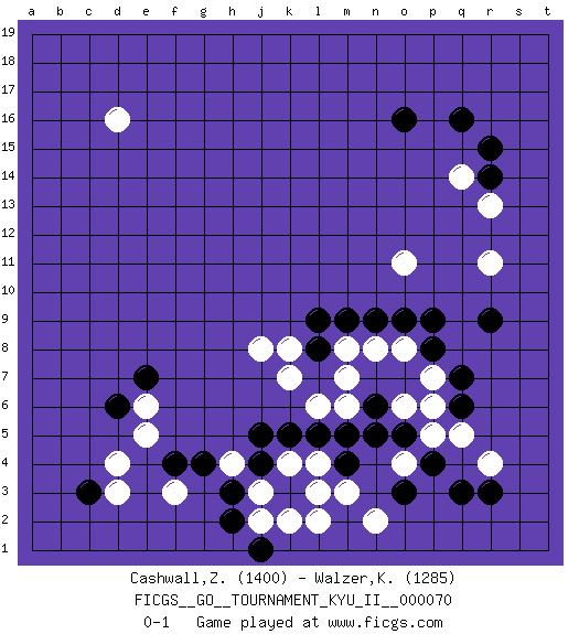 Last move : 0-1 2019 June 4 13:31:52 [Event "FICGS__GO__TOURNAMENT_KYU_II__000070"] [Site "FICGS"] [Date "2019.02.22"] [Round "1"] [Black "Cashwall,Zoomerhimmer"] [White "Walzer,Karel"] [Result "0-1"] [Rating 1 "1400"] [Rating 2 "1285"] 1.q16 d4 2.q3 d16 3.r9 q14 4.o16 r11 5.r14 r13 6.r15 q5 7.q7 r4 8.r3 o4 9.p4 p5 10.o5 o6 11.n5 p7 12.p8 o8 13.q6 p6 14.p9 o11 15.o9 n8 16.o3 m3 17.m4 l4 18.l5 k4 19.m9 m6 20.m5 l6 21.k5 k8 22.n9 m8 23.j4 j3 24.h3 h4 25.j5 j2 26.h2 l2 27.k3 l3 28.g4 n2 29.l9 j8 30.l8 k7 31.n6 m7 32.d6 f3 33.j1 k2 34.c3 e6 35.e7 e5 36.f4 d3 0-1 Here are the names of the openings (joseki) played in the four corners : Corner q16 : q16 q14 Hoshi (Hwajeom, Seongjeom, Xingwei`) 4-4 Point. The star or hoshi (4-4) point, emphasizing influence at the potential expense of territory. Ikken Takagakari (Hankan Nop'dakeolch'im, Yi Gaojia, 1-Space High Approach). Black typically responds at 6-4 or 3-10. Black 4-10 is played when Black finds play on the right side advantageous. Black 4-8 or 3-8 may be played when Black has support at top. Corner d4 : d4 j4 Hoshi (Hwajeom, Seongjeom, Xingwei`) 4-4 Point. The star or hoshi (4-4) point, emphasizing influence at the potential expense of territory. Player White won this Go (weiqi, baduk) game. Follow this game move after move (download)The nature of a game comes from what is played, but it's the sensitivity to the possible and the impossible that gives it value. (Pierre Audouard) He who defends everything defends nothing. (Frederick the Great)