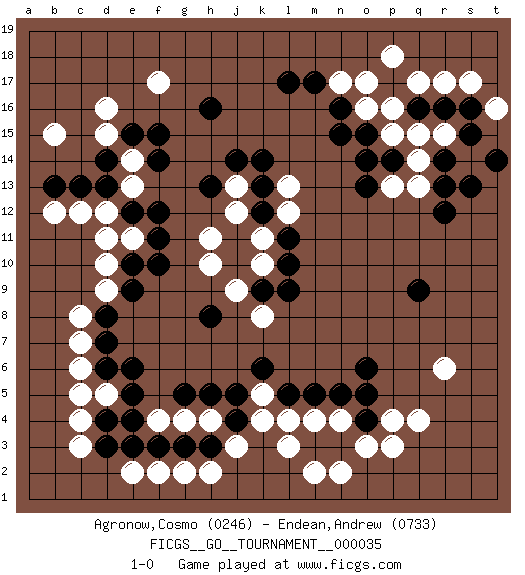 Last move : 1-0 2019 May 11 21:33:46 [Event "FICGS__GO__TOURNAMENT__000035"] [Site "FICGS"] [Date "2019.02.25"] [Round "1"] [Black "Agronow,Cosmo"] [White "Endean,Andrew"] [Result "1-0"] [Rating 1 "0246"] [Rating 2 "0733"] 1.d4 d16 2.q16 q4 3.o6 o3 4.m3 r6 5.q9 d10 6.f10 c6 7.e6 c8 8.d13 f17 9.h16 r17 10.s15 q17 11.p17 p18 12.l17 c3 13.d3 c4 14.b13 c12 15.c13 d12 16.e12 e11 17.f11 d5 18.e5 k4 19.d8 d9 20.e9 b12 21.f15 e13 22.f12 e14 23.e15 d15 24.d14 b15 25.e10 d11 26.f14 q15 27.p14 p16 28.r16 o17 29.n16 n17 30.m17 p15 31.o15 o16 32.n15 r15 33.s16 s14 34.d6 c5 35.d7 c7 36.r12 f4 37.h5 h4 38.g5 g4 39.j4 j3 40.j5 l4 41.l5 m4 42.m5 n4 43.o4 p3 44.n3 l3 45.h3 h2 46.g3 g2 47.f3 f2 48.e3 e2 49.e4 k5 50.k6 m2 51.n5 p4 52.o5 n2 53.r14 q14 54.r13 s17 55.t14 t16 56.s13 p13 57.o14 q13 58.o13 k10 59.l10 k11 60.l11 l12 61.k12 j12 62.k13 j13 63.j14 l13 64.k14 h11 65.k9 j9 66.h8 h10 67.h13 k8 68.l9 1-0 Here are the names of the openings (joseki) played in the four corners : Corner q4 : q4 o6 Hoshi (Hwajeom, Seongjeom, Xingwei`) 4-4 Point. The star or hoshi (4-4) point, emphasizing influence at the potential expense of territory. Corner d4 : d4 c6 Hoshi (Hwajeom, Seongjeom, Xingwei`) 4-4 Point. The star or hoshi (4-4) point, emphasizing influence at the potential expense of territory. Ikken Kakari (Hankan Keolch'im, Yi Gua`jiao~, 1-Space Low Approach). White 2 is the standard approach move to the 4-4. Corner d16 : d16 d13 Hoshi (Hwajeom, Seongjeom, Xingwei`) 4-4 Point. The star or hoshi (4-4) point, emphasizing influence at the potential expense of territory. Niken Takagakari (Dukan Nop'dakeolch'im, E`r Gaojia, 2-Space High Approach). Black 2 is a light approach move. Rarely played in even games, Black 2 is typically employed in handicap games. White continues with 6-4 or 3-10. In Korean Sunjang Baduk White has a stone on 8-4. Corner q16 : q16 r17 Hoshi (Hwajeom, Seongjeom, Xingwei`) 4-4 Point. The star or hoshi (4-4) point, emphasizing influence at the potential expense of territory. Player Black won this Go (weiqi, baduk) game. Follow this game move after move (download)Don't get surrounded ! Ever ! (Anonymous) If computers get too powerful, we can organize them into committees. That'll do them in. (Anonymous)