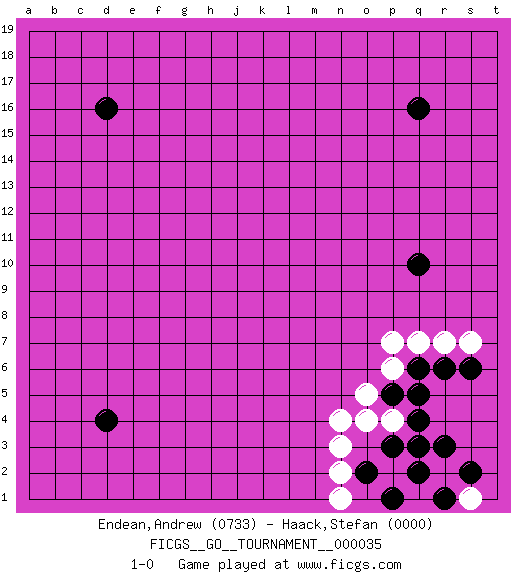 Last move : 1-0 2019 May 2 7:12:52 [Event "FICGS__GO__TOURNAMENT__000035"] [Site "FICGS"] [Date "2019.02.25"] [Round "1"] [Black "Endean,Andrew"] [White "Haack,Stefan"] [Result "1-0"] [Rating 1 "0733"] [Rating 2 "0000"] 1.q4 p7 2.d4 o5 3.r6 r7 4.s6 s7 5.q6 q7 6.q16 p6 7.p5 p4 8.q5 q3 9.r3 r2 10.p3 p2 11.q2 q1 12.q3 o4 13.o2 n2 14.p1 n3 15.d16 n1 16.s2 s1 17.r1 n4 18.q10 1-0 This go game has been lost on time (started : 2019.02.25 19:31:58) Here are the names of the openings (joseki) played in the four corners : Corner q4 : q4 p7 Hoshi (Hwajeom, Seongjeom, Xingwei`) 4-4 Point. The star or hoshi (4-4) point, emphasizing influence at the potential expense of territory. Player Black won this Go (weiqi, baduk) game. Follow this game move after move (download)For rectangular six in the corner, dame is necessary. (Anonymous) Art is not a thing, it is a way. (Elbert Hubbard)