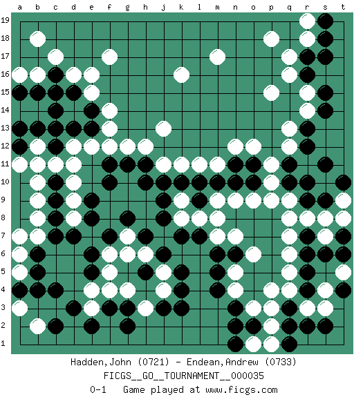 Last move : 0-1 2019 September 24 1:23:22 [Event "FICGS__GO__TOURNAMENT__000035"] [Site "FICGS"] [Date "2019.02.25"] [Round "1"] [Black "Hadden,John"] [White "Endean,Andrew"] [Result "0-1"] [Rating 1 "0721"] [Rating 2 "0733"] 1.c4 d16 2.r4 q16 3.k4 k16 4.r16 r15 5.r17 q17 6.c14 f17 7.c16 c17 8.d15 b16 9.c15 e16 10.b15 a16 11.a15 b18 12.r13 p15 13.s15 r14 14.s14 q13 15.r12 q12 16.q10 d10 17.c10 c11 18.c9 d9 19.d7 e15 20.c12 d12 21.b11 d11 22.d13 b12 23.c13 b10 24.b13 a11 25.e14 f14 26.e13 f13 27.k10 e3 28.d3 e4 29.g3 p3 30.q3 p4 31.n3 q6 32.r6 q7 33.r7 o6 34.n6 n7 35.m6 m7 36.l7 l8 37.k7 k8 38.j8 m9 39.m10 n9 40.n10 o9 41.l9 k9 42.l10 n5 43.m5 n4 44.m4 p10 45.j9 m8 46.o10 p9 47.q11 p11 48.h10 g12 49.f10 e12 50.a13 b9 51.c8 b8 52.c7 b7 53.b6 a6 54.b5 a5 55.a4 a7 56.e9 j11 57.j10 k11 58.f11 f12 59.e5 f5 60.e6 f6 61.f7 g4 62.f3 f4 63.e2 h3 64.g2 j4 65.k3 j5 66.k5 h6 67.h7 g7 68.g8 g6 69.h5 l11 70.g11 h12 71.h11 j13 72.j3 q5 73.r5 r8 74.r9 s8 75.s9 q9 76.r10 m11 77.o11 o12 78.n11 n12 79.j6 q4 80.q2 p2 81.o2 o3 82.n2 r18 83.s17 r19 84.s18 s7 85.s6 t9 86.t10 t8 87.s11 d8 88.e8 b2 89.c2 p1 90.q1 m17 91.s19 p18 92.a12 b11 93.t6 o1 94.n1 q8 95.t7 a3 96.b4 t5 97.t4 r3 98.r2 s3 99.s2 s4 0-1 Here are the names of the openings (joseki) played in the four corners : Corner q16 : q16 r16 Hoshi (Hwajeom, Seongjeom, Xingwei`) 4-4 Point. The star or hoshi (4-4) point, emphasizing influence at the potential expense of territory. Corner d16 : d16 c14 Hoshi (Hwajeom, Seongjeom, Xingwei`) 4-4 Point. The star or hoshi (4-4) point, emphasizing influence at the potential expense of territory. Ikken Kakari (Hankan Keolch'im, Yi Gua`jiao~, 1-Space Low Approach). Black 2 is the standard approach move to the 4-4. Corner q4 : r4 p3 Komoku (Somok, Xiao~mu`) 3-4 Point. The komoku (3-4) point is the traditional corner enclosure move.. Ikken Kakari (Hankan Keolch'im, Yi Gua`jiao~, 1-Space Low Pincer). The small knight move is the basic approach move to the 3-4 point stone. It has been continually used for over four centuries. There are limitless variations, with new moves constantly being discovered. White 2 opens the door to a treaure store of joseki. Player White won this Go (weiqi, baduk) game. Follow this game move after move (download)Avoid the plate connection. (Anonymous) Lottery : A tax on people who are bad at math. (Author unknown)