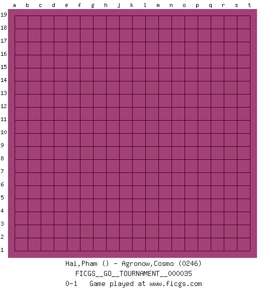 Last move : 0-1 2019 March 28 0:45:14 [Event "FICGS__GO__TOURNAMENT__000035"] [Site "FICGS"] [Date "2019.02.25"] [Round "1"] [Black "Hai,Pham"] [White "Agronow,Cosmo"] [Result "0-1"] [Rating 2 "0246"] 0-1 This go game has been lost on time (started : 2019.02.25 19:31:58) Here are the names of the openings (joseki) played in the four corners : Player White won this Go (weiqi, baduk) game. Follow this game move after move (download)Learning josekis by heart is useless if you don't try departing from them. (Pierre Audouard) There is a great deal of difference between an eager man who wants to read a book and a tired man who wants a book to read. (G.K. Chesterton)
