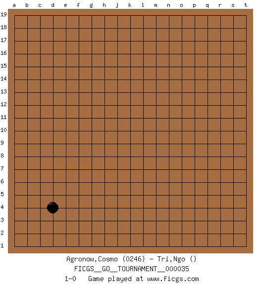 Last move : 1-0 2019 March 29 12:56:56 [Event "FICGS__GO__TOURNAMENT__000035"] [Site "FICGS"] [Date "2019.02.25"] [Round "1"] [Black "Agronow,Cosmo"] [White "Tri,Ngo"] [Result "1-0"] [Rating 1 "0246"] 1.d4 1-0 This go game has been lost on time (started : 2019.02.25 19:31:58) Here are the names of the openings (joseki) played in the four corners : Corner d4 : d4 1-0 Hoshi (Hwajeom, Seongjeom, Xingwei`) 4-4 Point. The star or hoshi (4-4) point, emphasizing influence at the potential expense of territory. Player Black won this Go (weiqi, baduk) game. Follow this game move after move (download)A few moments to learn, a lifetime to master. (Ancient proverb) Follow your passion, and success will follow you. (Arthur Buddhold)