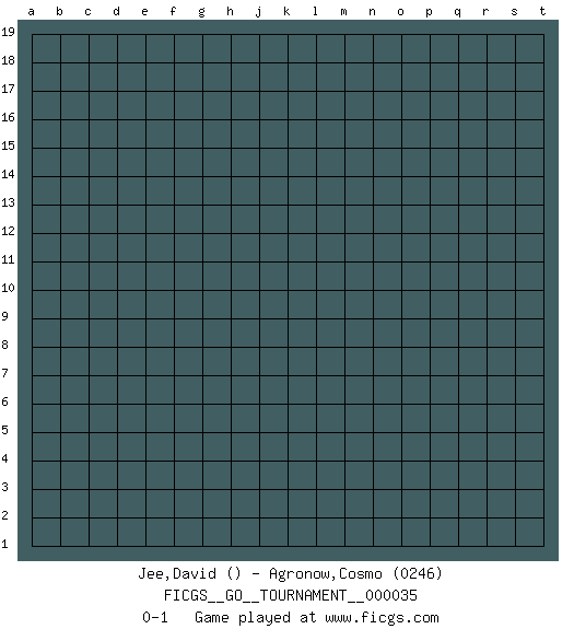 Last move : 0-1 2019 March 28 0:45:14 [Event "FICGS__GO__TOURNAMENT__000035"] [Site "FICGS"] [Date "2019.02.25"] [Round "1"] [Black "Jee,David"] [White "Agronow,Cosmo"] [Result "0-1"] [Rating 2 "0246"] 0-1 This go game has been lost on time (started : 2019.02.25 19:31:58) Here are the names of the openings (joseki) played in the four corners : Player White won this Go (weiqi, baduk) game. Follow this game move after move (download)A meijin needs no joseki. (Anonymous) Memory is a crazy woman that hoards colored rags and throws away food. (Austin O'Malley)