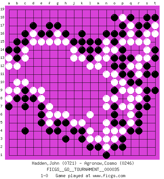 Last move : 1-0 2019 July 25 18:20:14 [Event "FICGS__GO__TOURNAMENT__000035"] [Site "FICGS"] [Date "2019.02.25"] [Round "1"] [Black "Hadden,John"] [White "Agronow,Cosmo"] [Result "1-0"] [Rating 1 "0721"] [Rating 2 "0246"] 1.c4 q16 2.r4 d16 3.k4 r8 4.c16 f7 5.f4 n4 6.p3 l6 7.d17 d15 8.c15 c14 9.c7 c10 10.c9 d9 11.d8 e8 12.e7 f6 13.e6 b9 14.c8 e9 15.b8 b10 16.g17 g16 17.k16 k15 18.n16 n15 19.p17 r12 20.r17 q17 21.q18 q5 22.r5 n2 23.l2 h4 24.h3 j5 25.r7 q7 26.r6 q6 27.r16 r15 28.p16 q15 29.o15 o14 30.m15 n14 31.l15 l14 32.h16 g15 33.f16 f15 34.e16 e15 35.f17 p15 36.o16 s16 37.s17 s15 38.j4 l3 39.k3 l4 40.h5 h6 41.g5 f5 42.e5 g6 43.g4 k5 44.o2 o3 45.p2 p4 46.q4 a8 47.a7 a9 48.b14 c13 49.b13 b12 50.s8 r9 51.s9 s10 52.m2 m3 53.n1 n3 54.j15 j14 55.k14 k13 56.k15 j13 57.m14 m13 58.l13 l12 59.l14 m12 60.s7 t10 61.t9 t17 62.t18 t16 63.s18 h15 64.b15 a13 65.a14 a12 66.p5 o4 67.o5 n5 68.o6 n7 69.o7 o8 70.p8 q8 71.o9 n8 72.r10 p9 73.s11 r11 74.t11 p7 75.q10 p10 76.s12 s13 77.q11 q12 78.p11 o10 79.p12 p13 80.o12 n11 81.o13 o11 82.q13 r13 83.p14 n13 84.p13 q9 85.t14 s14 86.t13 p18 87.o18 1-0 Here are the names of the openings (joseki) played in the four corners : Corner q4 : r4 r8 Komoku (Somok, Xiao~mu`) 3-4 Point. The komoku (3-4) point is the traditional corner enclosure move.. Corner d16 : d16 c16 Hoshi (Hwajeom, Seongjeom, Xingwei`) 4-4 Point. The star or hoshi (4-4) point, emphasizing influence at the potential expense of territory. Corner d4 : c4 f7 Komoku (Somok, Xiao~mu`) 3-4 Point. The komoku (3-4) point is the traditional corner enclosure move.. Corner q16 : q16 n16 Hoshi (Hwajeom, Seongjeom, Xingwei`) 4-4 Point. The star or hoshi (4-4) point, emphasizing influence at the potential expense of territory. Niken Takagakari (Dukan Nop'dakeolch'im, E`r Gaojia, 2-Space High Approach). Black 2 is a light approach move. Rarely played in even games, Black 2 is typically employed in handicap games. White continues with 6-4 or 3-10. In Korean Sunjang Baduk White has a stone on 8-4. Player Black won this Go (weiqi, baduk) game. Follow this game move after move (download)If your stone is capped, play the knight's move. (Anonymous) Bobby never cared about money, though. His only desire was to prove that his choices were correct: He wanted chess to be important because he was a chess player, and he wanted to be important. Bobby knew money was important, but he didn't have a clue why, outside of clothes and status. The only way he could accomplish what he wanted was to fight for a lot of money. Once he got it, he gave it away. He did not know how to spend it. And once he'd become champion, after, essentially, sacrificing his life for it, he didn't know how to spend his time. (Bob Wade)