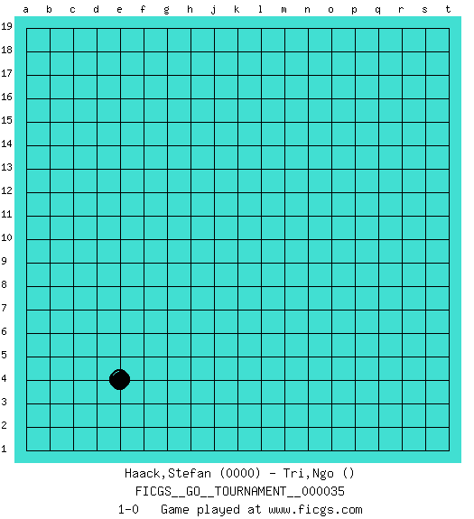 Last move : 1-0 2019 March 29 12:56:56 [Event "FICGS__GO__TOURNAMENT__000035"] [Site "FICGS"] [Date "2019.02.25"] [Round "1"] [Black "Haack,Stefan"] [White "Tri,Ngo"] [Result "1-0"] [Rating 1 "0000"] 1.e4 1-0 This go game has been lost on time (started : 2019.02.25 19:31:58) Here are the names of the openings (joseki) played in the four corners : Corner d4 : e4 1-0 Takamoku (Gomok, Gaomu`) 5-4 Point. The takamoku (high) point (5-4). With its emphasis on influence, the 5-4 point complements the 4-4 (hoshi) point in creating an influence-oriented fuseki. Player Black won this Go (weiqi, baduk) game. Follow this game move after move (download)A knight's move near the edge of the board cannot be cut. (Bill Taylor) Hold em is to stud what chess is to checkers. (Johnny Moss)