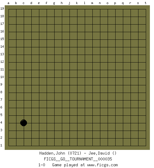 Last move : 1-0 2019 March 28 0:45:14 [Event "FICGS__GO__TOURNAMENT__000035"] [Site "FICGS"] [Date "2019.02.25"] [Round "1"] [Black "Hadden,John"] [White "Jee,David"] [Result "1-0"] [Rating 1 "0721"] 1.c4 1-0 This go game has been lost on time (started : 2019.02.25 19:31:58) Here are the names of the openings (joseki) played in the four corners : Corner d4 : c4 1-0 Komoku (Somok, Xiao~mu`) 3-4 Point. The komoku (3-4) point is the traditional corner enclosure move.. Player Black won this Go (weiqi, baduk) game. Follow this game move after move (download)Ikken tobi is never wrong. (Anonymous) The hypothalamus is one of the most important parts of the brain, involved in many kinds of motivation, among other functions. The hypothalamus controls the 'Four Fs: Fighting, Fleeing, Feeding and Mating. (Unknown author)