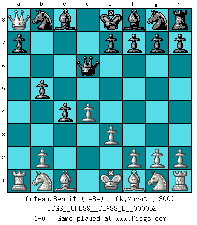 Last move : 1-0 2007 July 16 11:6:57 [Event "FICGS__CHESS__CLASS_E__000052"] [Site "FICGS"] [Date "2007.06.03"] [Round "1"] [White "Arteau,Benoit"] [Black "Ak,Murat"] [Result "1-0"] [WhiteElo "1484"] [BlackElo "1300"] 1.d4 d5 2.c4 dxc4 3.e3 b5 4.a4 c6 5.axb5 cxb5 6.Qf3 Qd6 7.Qxa8 1-0 This chess game has been lost on time (started : 2007.06.03 15:42:46) Queen's gambit accepted Player White won this chess game. Follow this game move after move (download)He who fears an isolated Queen's Pawn should give up Chess. (Siegbert Tarrasch) Nach Morphy wurde nichts neues mehr in der Behandlung offener Positionen gefunden. (Mikhail Moiseyevich Botvinik) El Ajedrez es un expediente tonto que hace creer a la gente inactiva que hacen una cosa muy astuta cuando solamente estan perdiendo su tiempo. (George Bernard Shaw) Vous m'avez demandé de vous exposer quel est le fondement de la prière. Je ne fais que préparer les pièces du jeu sur la table... Nous sera-t-il permis d'en adopter les règles et si nous les appliquons scrupuleusement nous ne tarderons pas à faire mat le Roi divin ! Il ne pourra échapper à nos mains. (Sainte Thérèse d'Avila, Chemin de perfection) Children in the dark cause accidents, accidents in the dark cause children. (Unknown)