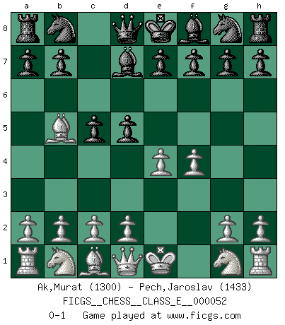 Last move : 0-1 2007 July 19 17:43:41 [Event "FICGS__CHESS__CLASS_E__000052"] [Site "FICGS"] [Date "2007.06.03"] [Round "1"] [White "Ak,Murat"] [Black "Pech,Jaroslav"] [Result "0-1"] [WhiteElo "1300"] [BlackElo "1433"] 1.e4 c5 2.f4 d5 3.Bb5+ Bd7 0-1 This chess game has been lost on time (started : 2007.06.03 15:42:46) Sicilian : Grand Prix attack Player Black won this chess game. Follow this game move after move (download)Chess is mental torture. (Garry Kasparov) Wir können eben der zündenden Macht des Opfers nicht wiederstehen, denn die Begeisterung für das Opfer liegt in der Natur des Menschen. (Rudolf Spielmann) Realmente no sabemos como el juego fue inventado, aunque hay sospechas. Tan pronto como descubramos a los culpables, se los haremos saber. (Bruce Pandolfini) Les écrivains ont utilisé les échecs pour analyser les côtés extrêmes de la nature humaine. Dans ce cadre, les échecs offrent un champ d'expérimentation idéal. Mais on pourrait faire la même chose avec la peinture. Et là, en vous référant à Van Gogh, vous ne tirerez pas de conclusion définitive sur les peintres. (Gary Kasparov) Cactus - It is depressed cucumber. (Ilmars Cirulis)