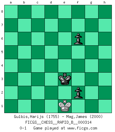 Last move : 0-1 2019 April 23 8:16:42 [Event "FICGS__CHESS__RAPID_B__000314"] [Site "FICGS"] [Date "2019.03.01"] [Round "1"] [White "Gulbis,Harijs"] [Black "Mag,James"] [Result "0-1"] [WhiteElo "1755"] [BlackElo "2000"] 1.e4 c5 2.Nf3 d6 3.d4 cxd4 4.Nxd4 Nf6 5.Nc3 a6 6.h3 e6 7.g4 h6 8.a3 b5 9.g5 hxg5 10.Bxg5 Nbd7 11.Qe2 Bb7 12.h4 Qb6 13.Be3 d5 14.exd5 Nxd5 15.Nxd5 Bxd5 16.Rh3 Rc8 17.O-O-O Nf6 18.Bg5 Ne4 19.Bg2 Nxg5 20.hxg5 Rxh3 21.Bxh3 b4 22.a4 b3 23.c3 g6 24.Bg4 Bg7 25.Kb1 Qb7 26.Bf3 Bxd4 27.Bxd5 Qxd5 28.Rxd4 Qxg5 29.Qf3 a5 30.c4 Qf5+ 31.Qxf5 gxf5 32.Kc1 e5 33.Rd5 Rxc4+ 34.Kd1 f6 35.Rxa5 Rc2 36.Rb5 Rxb2 37.f4 Rb1+ 38.Ke2 b2 39.Kd3 Rd1+ 40.Kc2 b1Q+ 41.Rxb1 Rxb1 42.Kxb1 Kd7 43.Kb2 Kc6 44.Kc3 Kb6 45.Kb4 Ka6 46.Kc4 Ka5 47.Kb3 exf4 48.Kc3 Kxa4 49.Kd3 Kb3 50.Ke2 Kc4 51.Kf3 Kd5 52.Kxf4 Ke6 53.Kf3 Ke5 54.Ke3 f4+ 55.Kf3 Kf5 56.Kf2 Ke4 57.Ke2 f3+ 58.Kf2 Kf4 59.Kf1 Ke3 60.Ke1 f2+ 0-1 Sicilian : Najdorf, Adams attack Queenside Castling by player White (move 17) 10 pieces endgame at move 36 : White KRPP , Black KRPPPP WHITE : King + 1 Rook 2 Pawns BLACK : King + 1 Rook 4 Pawns Promotion Queen by player Black (move 40) 9 pieces endgame at move 41 : White KRPP , Black KRPPP WHITE : King + 1 Rook 2 Pawns BLACK : King + 1 Rook 3 Pawns 8 pieces endgame at move 41 : White KPP , Black KRPPP WHITE : King + 2 Pawns BLACK : King + 1 Rook 3 Pawns 7 pieces endgame at move 42 : White KPP , Black KPPP WHITE : King + 2 Pawns BLACK : King + 3 Pawns 6 pieces endgame at move 47 : White KP , Black KPPP WHITE : King + 1 Pawn BLACK : King + 3 Pawns 5 pieces endgame at move 48 : White K , Black KPPP WHITE : King + BLACK : King + 3 Pawns 4 pieces endgame at move 52 : White K , Black KPP WHITE : King + BLACK : King + 2 Pawns Player Black won this chess game. Follow this game move after move (download)A bad day of Chess is better than any good day at work. (Anonymous) Wenn ein Kopf und ein Buch zusammenstoßen und es klingt hohl, ist es denn allemal im Buche? (Georg Christoph Lichtenberg) Prefiero perder una partida realmente buena, que ganar una mala. (David Levy) Pour se monter efficace, un Cavalier a besoin d'avant-postes ! Les Cavaliers font les meilleurs bloqueurs de pions passés. Perception is reality. (Immanuel Kant)