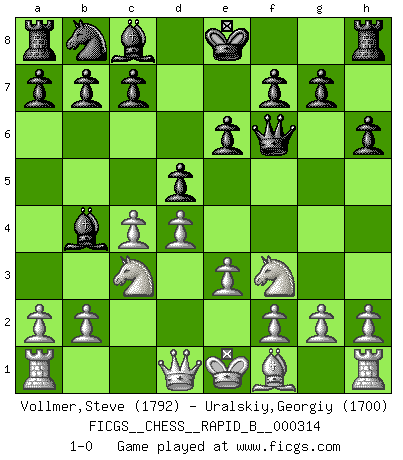 Last move : 1-0 2019 April 15 17:16:33 [Event "FICGS__CHESS__RAPID_B__000314"] [Site "FICGS"] [Date "2019.03.01"] [Round "1"] [White "Vollmer,Steve"] [Black "Uralskiy,Georgiy"] [Result "1-0"] [WhiteElo "1792"] [BlackElo "1700"] 1.d4 d5 2.c4 e6 3.Nc3 Nf6 4.Nf3 Bb4 5.Bg5 h6 6.Bxf6 Qxf6 7.e3 1-0 This chess game has been lost on time (started : 2019.03.01 20:0:28) QGD : Ragozin variation Player White won this chess game. Follow this game move after move (download)In blitz, the Knight is stronger than the Bishop. (Vlastimil Hort) Ich rechne überhaupt nicht voraus. Ich gewinne auch so. (Robert James Fischer) Por la belleza de sus partidas, la claridad de su juego y lo brillante de sus ideas, Fischer se creó el mismo como un artista de la misma estatura como Brahms, Rembrandt y Shakespeare. (David Levy) L'ordinateur a tué l'originalité. Il n'y a plus guère d'aventures sur l'échiquier. (Jacob Murray) The ultimate in disposing one's troops is to be without ascertainable shape. Then the most penetrating spies cannot pry in nor can the wise lay plans against you. (Sun Tzu)