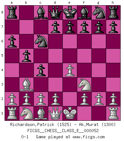 Last move : 0-1 2007 June 6 14:44:36 [Event "FICGS__CHESS__CLASS_E__000052"] [Site "FICGS"] [Date "2007.06.03"] [Round "1"] [White "Richardson,Patrick"] [Black "Ak,Murat"] [Result "0-1"] [WhiteElo "1525"] [BlackElo "1300"] 1.e4 c5 2.Nf3 Nc6 3.Bb5 a6 4.Ba4 b5 5.Bb3 c4 0-1 Sicilian : Nimzovich-Rossolimo attack (without ...d6) Player Black won this chess game. Follow this game move after move (download)It is peculiar but a fact nevertheless, that gamblers in chess always have enthusiastic followers. (Botvinnik) Es ist nicht das erste mal, dass sich die FIDE dem Arabischen Geld gebeugt hat (über die FIDE WM 2004 in Lybien). (Larry Evans) Muchos jugadores de Ajedrez se sorprendían cuando después de la partida, Fischer explicaba con calma: 'Yo ya había analizado esta posibilidad' en una posición en la cual yo creía que no era posible de prever desde la apertura. (Mikhail Tal) RxDa4 pat (...) There are two types of people in this world, good and bad. The good sleep better, but the bad seem to enjoy the waking hours much more. (Woody Allen)