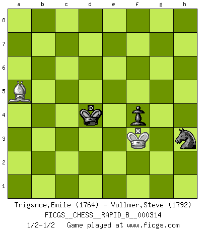 Last move : 1/2-1/2 2019 April 14 14:46:38 [Event "FICGS__CHESS__RAPID_B__000314"] [Site "FICGS"] [Date "2019.03.01"] [Round "1"] [White "Trigance,Emile"] [Black "Vollmer,Steve"] [Result "1/2-1/2"] [WhiteElo "1764"] [BlackElo "1792"] 1.e4 c5 2.c3 d5 3.exd5 Qxd5 4.d4 cxd4 5.cxd4 e6 6.Nf3 Nf6 7.Nc3 Qd8 8.Bd3 Be7 9.O-O Nc6 10.a3 O-O 11.Re1 b6 12.Bc2 Bb7 13.Bg5 h6 14.Be3 Re8 15.Qd3 Bf8 16.Rad1 Ne7 17.Qe2 Ned5 18.Bc1 Nxc3 19.bxc3 Rc8 20.Qd3 Qc7 21.Bb2 Bd5 22.Ne5 Bc4 23.Qh3 Nd5 24.Bc1 Ba6 25.Qh5 Qe7 26.Qg4 Rxc3 27.Bd3 Bxd3 28.Rxd3 Rxd3 29.Nxd3 Qf6 30.Ne5 Rd8 31.Nc6 Ra8 32.Ne5 Be7 33.Qh5 Qf5 34.Qxf5 exf5 35.Nc6 Bf6 36.Bb2 a6 37.Ne5 g6 38.g3 Rc8 39.Rc1 Rxc1+ 40.Bxc1 Kg7 41.Nc6 g5 42.Kf1 Kg6 43.Ke2 f4 44.Kf3 fxg3 45.fxg3 Kf5 46.g4+ Ke6 47.Ke4 a5 48.Na7 a4 49.Nb5 Be7 50.h3 h5 51.gxh5 Nf6+ 52.Kd3 Nxh5 53.Nc3 f5 54.Nxa4 Bd8 55.Nxb6 Bxb6 56.Bxg5 Kd5 57.Be3 Bd8 58.a4 Ng3 59.Bd2 Ne4 60.Be1 f4 61.a5 Bxa5 62.Bxa5 Nf2+ 63.Ke2 Nxh3 64.Kf3 Kxd4 1/2-1/2 Sicilian : Alapin's variation (2.c3) Kingside Castling by player White (move 9) Kingside Castling by player Black (move 10) 10 pieces endgame at move 55 : White KBPPP , Black KBNPP WHITE : King + 1 Bishop 3 Pawns BLACK : King + 1 Bishop 1 Knight 2 Pawns 9 pieces endgame at move 56 : White KBPPP , Black KBNP WHITE : King + 1 Bishop 3 Pawns BLACK : King + 1 Bishop 1 Knight 1 Pawn 8 pieces endgame at move 61 : White KBPP , Black KBNP WHITE : King + 1 Bishop 2 Pawns BLACK : King + 1 Bishop 1 Knight 1 Pawn 7 pieces endgame at move 62 : White KBPP , Black KNP WHITE : King + 1 Bishop 2 Pawns BLACK : King + 1 Knight 1 Pawn 6 pieces endgame at move 63 : White KBP , Black KNP WHITE : King + 1 Bishop 1 Pawn BLACK : King + 1 Knight 1 Pawn 5 pieces endgame at move 64 : White KB , Black KNP WHITE : King + 1 Bishop BLACK : King + 1 Knight 1 Pawn This chess game ended in a draw. Follow this game move after move (download)After black's reply to 1.e4 with 1..e5, leaves him always trying to get into the game. (Howard Staunton) Der beste Spieler in einem Turnier gewinnt es nie. Er landet auf Platz zwei oder drei. (Siegbert Tarrasch) ¿Que sería del Ajedrez sin errores graciosos?. (Kurt Richter) On entre au jeu d'Echecs comme on entre en Religion. Pour le joueur d'Echecs, la partie d'Echecs c'est l'office, la messe, le défilé du 1er Mai, le dépôt de gerbe au Monument aux Morts. C'est un drame sacré. (Michel Roos) Home computers are being called upon to perform many new functions, including the consumption of homework formerly eaten by the dog. (Doug Larson)