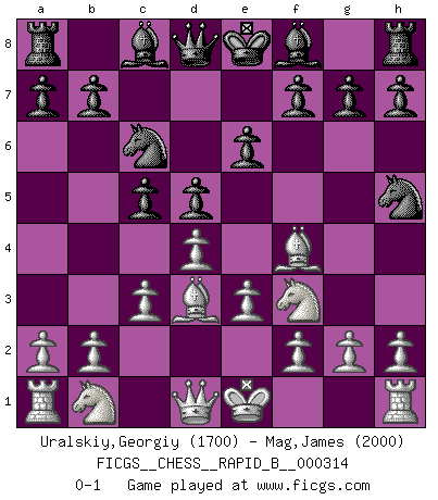 Last move : 0-1 2019 April 8 3:43:18 [Event "FICGS__CHESS__RAPID_B__000314"] [Site "FICGS"] [Date "2019.03.01"] [Round "1"] [White "Uralskiy,Georgiy"] [Black "Mag,James"] [Result "0-1"] [WhiteElo "1700"] [BlackElo "2000"] 1.d4 Nf6 2.Nf3 d5 3.Bf4 c5 4.e3 Nc6 5.c3 e6 6.Bd3 Nh5 0-1 This chess game has been lost on time (started : 2019.03.01 20:0:28) Queen's pawn game Player Black won this chess game. Follow this game move after move (download)Bobby Fischer is the greatest Chess genius of all time ! (Alexander Kotov) Jede Eröffnung ist gut genug um gespielt zu werden, wenn nur ihr Ruf schlecht genug ist. (Savielly Grigorievitsch Tartakower) Peones: ellos son el alma de esta partida, solos forman el ataque y la defensa. (Philidor) Les sacrifices démontrent seulement que quelqu'un a gaffé. (Savielly Tartacover) Thibault, I ask for draw. Game 13876. - Sorry Ilmars, you won. (FICGS chat)