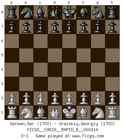 Last move : 0-1 2019 April 1 2:23:35 [Event "FICGS__CHESS__RAPID_B__000314"] [Site "FICGS"] [Date "2019.03.01"] [Round "1"] [White "German,Ger"] [Black "Uralskiy,Georgiy"] [Result "0-1"] [WhiteElo "1700"] [BlackElo "1700"] 0-1 This chess game has been lost on time (started : 2019.03.01 20:0:28) Player Black won this chess game. Follow this game move after move (download)When you don't know what to do, wait for your opponent to get an idea - it's sure to be wrong. (Tarrasch) Ich habe kein Problem mit Frauen, sondern nur mit dem Niveau ihres Schachspiels (Judith Polgar) Si el ingenio solamente fuese necesario para lucirse, las mujeres serían las mejores jugadoras de Ajedrez del mundo. (Albin) La victoire dans une partie d'Echecs appartient la plupart du temps à celui qui voit un peu plus loin que l'adversaire. (Lasker) A good book on your shelf is a friend that turns its back on you and remains a friend. (Author unknown)