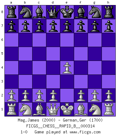 Last move : 1-0 2019 April 1 14:27:52 [Event "FICGS__CHESS__RAPID_B__000314"] [Site "FICGS"] [Date "2019.03.01"] [Round "1"] [White "Mag,James"] [Black "German,Ger"] [Result "1-0"] [WhiteElo "2000"] [BlackElo "1700"] 1.e4 1-0 This chess game has been lost on time (started : 2019.03.01 20:0:28) King's pawn Opening Player White won this chess game. Follow this game move after move (download)The chessboard is the world, the pieces are the phenomena of the Universe, the rules of the game are what we call the laws of Nature and the player on the other side is hidden from us. (Thomas Huxley) Der Umstand, daß uns eine 7 Stunden Zeitkontrolle ermöglicht eine großartige, tiefe Partie zu spielen, ist für die Massenmedien nicht weiter von Bedeutung. (Alexej Shirov) Después de la respuesta de las negras a 1.e4 con 1..e5, se quedan siempre tratando de entrar dentro del juego. (Howard Staunton) Vous n'êtes pas toujours obligé de jouer le meilleur coup. Un coup doit être actif, entreprenant, correct et beau ! (David Bronstein) The right perception of any matter and a misunderstanding of the same matter do not wholly exclude each other. (Kafka's the trial)