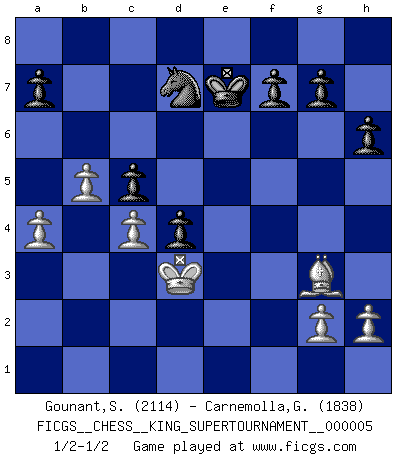 Last move : 1/2-1/2 2019 April 3 23:36:19 [Event "FICGS__CHESS__KING_SUPERTOURNAMENT__000005"] [Site "FICGS"] [Date "2019.03.01"] [Round "1"] [White "Gounant,Stanislas"] [Black "Carnemolla,Giampaolo"] [Result "1/2-1/2"] [WhiteElo "2114"] [BlackElo "1838"] 1.e4 e5 2.f4 Bc5 3.Nf3 d6 4.c3 Bg4 5.fxe5 dxe5 6.Qa4+ Bd7 7.Qc2 Qf6 8.b4 Bb6 9.d3 h6 10.Na3 Be6 11.Nc4 Bxc4 12.dxc4 c5 13.Be3 Nd7 14.Qa4 Qc6 15.Qxc6 bxc6 16.b5 cxb5 17.cxb5 Ngf6 18.Bd3 O-O 19.c4 Ba5+ 20.Ke2 Bc3 21.Rac1 Bd4 22.Nxd4 exd4 23.Bd2 Rfe8 24.a4 Nxe4 25.Bxe4 Rxe4+ 26.Kd3 Rae8 27.Rhe1 Rxe1 28.Rxe1 Rxe1 29.Bxe1 Kf8 30.Bg3 Ke7 1/2-1/2 KGD : Classical, Marshall attack Kingside Castling by player Black (move 18) This chess game ended in a draw. Follow this game move after move (download)Chess problems demand from the composer the same virtues that characterize all worthwhile art: originality, invention, conciseness, harmony, complexity, and splendid insincerity. (Vladimir Nabokov) Der Partner hat auch seine Existenzberechtigung. (Savielly Grigorievitsch Tartakower) El Ajedrez expande y enriquece tu mente. (Saudin Robovic) Celui qui prend des risques peut perdre, celui qui n'en prend pas perd toujours. (Xavier Tartacover) Everything in life is luck. (Donald Trump)
