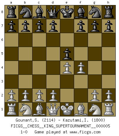 Last move : 1-0 2019 April 1 2:23:35 [Event "FICGS__CHESS__KING_SUPERTOURNAMENT__000005"] [Site "FICGS"] [Date "2019.03.01"] [Round "1"] [White "Gounant,Stanislas"] [Black "Kazutami,Indra"] [Result "1-0"] [WhiteElo "2114"] [BlackElo "1800"] 1.e4 e5 2.f4 1-0 This chess game has been lost on time (started : 2019.03.01 23:14:54) King's gambit Player White won this chess game. Follow this game move after move (download)If a ruler does not understand Chess, how can he rule over a kingdom ? (King Khusros II) Wie kann ich Remis annehmen? Ich weiß ja gar nicht, wie ich stehe! (Fritz Sämisch) No hay un Gran Maestro de Ajedrez que sea normal; solo se diferencían ellos por la magnitud de su locura. (Viktor Korchnoi) Dans le domaine de la peinture, de la gravure et de la sculpture, dès la première décennie de notre siècle, les artistes abandonnent la représentation de la partie d'échecs pour se concentrer sur les pièces, sur les échiquiers et sur toutes les variations auxquelles les unes et les autres peuvent donner lieu. On passe en quelque sorte d'un thème social à un thème musical (au sens de la musica médiévale, c'est-à-dire d'une notion qui inclue le rythme, l'harmonie, la construction et la déconstruction, etc.). Graphiquement et picturalement, l'échiquier apparaît comme une structure ouverte, dynamique, d'une richesse infinie, autorisant toutes les combinatoires et débouchant sur des mouvements et des rythmes de nature exponentielle. (Michel Pastoureau) Unless in communicating with it one says exactly what one means, trouble is bound to result. (Alan Turing, about computers)