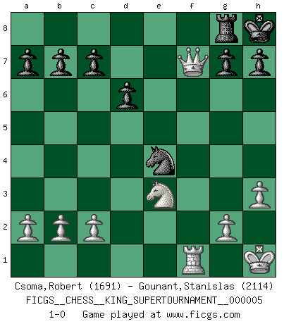 Last move : 1-0 2019 March 13 17:56:27 [Event "FICGS__CHESS__KING_SUPERTOURNAMENT__000005"] [Site "FICGS"] [Date "2019.03.01"] [Round "1"] [White "Csoma,Robert"] [Black "Gounant,Stanislas"] [Result "1-0"] [WhiteElo "1691"] [BlackElo "2114"] 1.e4 e5 2.f4 Nc6 3.Nf3 f5 4.d3 d6 5.Be2 Nf6 6.Nc3 Be7 7.O-O O-O 8.h3 fxe4 9.dxe4 exf4 10.Bc4+ Kh8 11.Ng5 Ne5 12.Ne6 Bxe6 13.Bxe6 Nfd7 14.Bxf4 Bg5 15.Bxg5 Rxf1+ 16.Qxf1 Qxg5 17.Qe2 Nc5 18.Bc4 Nxc4 19.Qxc4 Qe3+ 20.Kh1 Re8 21.Qf7 Rc8 22.Rf1 Rg8 23.Nd5 Nxe4 24.Nxe3 1-0 King's gambit Kingside Castling by player White (move 7) Kingside Castling by player Black (move 7) Player White won this chess game. Follow this game move after move (download)As one by one I mowed them down, my superiority soon became apparent. (Jose Capablanca) Frage des Reporters: -Welche besonderen Umstände rechtfertigen das Anhalten der Uhren während einer Turnierpartie? Antwort: -Einen Fotographen zu strangulieren. (Siegbert Tarrasch) Cada Peón es una Reina en potencia. (James Mason) Comme les marins qui ont mille raisons différentes d'aller en mer, les joueurs d'échecs en ont tout autant avant de s'installer devant une table et jouer... (Vincent Bertignac, philosophe) The only thing that matters is the evidence. (Horatio Caine, C.S.I. Miami)