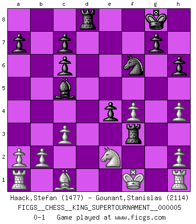 Last move : 0-1 2019 April 19 5:43:18 [Event "FICGS__CHESS__KING_SUPERTOURNAMENT__000005"] [Site "FICGS"] [Date "2019.03.01"] [Round "1"] [White "Haack,Stefan"] [Black "Gounant,Stanislas"] [Result "0-1"] [WhiteElo "1477"] [BlackElo "2114"] 1.e4 e5 2.f4 Nc6 3.Nf3 f5 4.Nc3 fxe4 5.Nxe4 d5 6.Neg5 e4 7.Ng1 Nf6 8.d3 Bf5 9.dxe4 dxe4 10.Qxd8+ Rxd8 11.Bb5 h6 12.N5h3 Bc5 13.c3 O-O 14.Bxc6 bxc6 15.Ne2 Bxh3 16.gxh3 Rd3 17.h4 Rfd8 18.Kf1 Rf3+ 0-1 This chess game has been lost on time (started : 2019.03.01 23:14:54) King's gambit Kingside Castling by player Black (move 13) Player Black won this chess game. Follow this game move after move (download)Openings teach you openings. Endgames teach you chess ! (Stephan Gerzadowicz) Ein Großmeister muß tausende Partien in seinem Kopf speichern, denn diese sind für Ihn, was die Worte der Muttersprache für gewöhnliche Leute sind, oder Noten für Musiker... (Garry Kasparov) Las combinaciones han sido siempre el aspecto más intrigante del Ajedrez. Los Maestros las buscan, el público las aplauden, los críticos las alaban. La razón se debe a que las combinaciones hacen posible que el Ajedrez sea más que un ejercicio matemático con una carencia de vida. Ellas son la poesía del juego, son del Ajedrez lo que la melodía es de la música. Ellas representan el triunfo de la mente sobre la materia. (Reuben Fine) Shah mat. Le roi est mort. Cri de fierté d'un joueur venant de terrasser son adversaire, courtoisement, sans effusion de sang. There will be no order, only chaos. (Sol Robeson in Pi by Darren Aronofsky)
