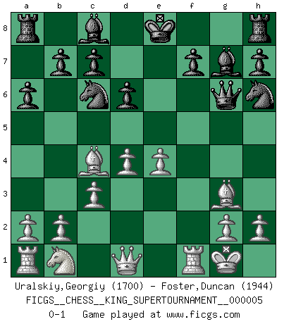 Last move : 0-1 2019 April 21 5:54:49 [Event "FICGS__CHESS__KING_SUPERTOURNAMENT__000005"] [Site "FICGS"] [Date "2019.03.01"] [Round "1"] [White "Uralskiy,Georgiy"] [Black "Foster,Duncan"] [Result "0-1"] [WhiteElo "1700"] [BlackElo "1944"] 1.e4 e5 2.f4 exf4 3.Nf3 d6 4.Bc4 a6 5.d4 g5 6.O-O Bg7 7.c3 Nc6 8.Nxg5 Qxg5 9.Bxf4 Qg6 10.Bg3 Nh6 0-1 This chess game has been lost on time (started : 2019.03.01 23:14:54) KGA : Fischer defense Kingside Castling by player White (move 6) Player Black won this chess game. Follow this game move after move (download)Every Pawn is a potential Queen. (James Mason) Schach wird sich dank seiner hohen kulturellen Tradition immer durchsetzen. In näherer Zukunft womöglich sogar als Gegenreaktion auf die maßlose Reizüberflutung im Freizeit- und Spielbereich. (Garry Kasparov) El Ajedrez es tortura mental. (Garry Kasparov) Je fais ceci parce que dans cinquante coups j'obtiendrai cela; je m'appelle Mikhail Moisevitch Botvinnik. (Botvinnik) All men can see these tactics whereby I conquer, but what none can see is the strategy out of which victory is evolved. (Sun Tzu)