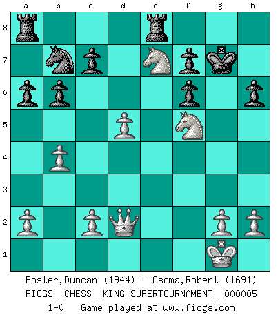 Last move : 1-0 2019 May 1 22:4:7 [Event "FICGS__CHESS__KING_SUPERTOURNAMENT__000005"] [Site "FICGS"] [Date "2019.03.01"] [Round "1"] [White "Foster,Duncan"] [Black "Csoma,Robert"] [Result "1-0"] [WhiteElo "1944"] [BlackElo "1691"] 1.e4 e5 2.f4 exf4 3.Nf3 d6 4.Bc4 Be6 5.Qe2 Nf6 6.Nc3 Bxc4 7.Qxc4 Be7 8.d3 O-O 9.Bxf4 Nc6 10.O-O Qd7 11.d4 a6 12.d5 Na5 13.Qd3 b6 14.Rae1 Nb7 15.e5 Nc5 16.Qd2 dxe5 17.Nxe5 Qc8 18.Nc6 Bd8 19.Rf3 Qd7 20.b4 Nb7 21.Bg5 h6 22.Bxf6 Bxf6 23.Rxf6 gxf6 24.Ne4 Kg7 25.Re3 Qf5 26.Ne7 Qe5 27.Rg3+ Qxg3 28.Nxg3 Rfe8 29.Ngf5+ 1-0 KGA : Fischer defense Kingside Castling by player Black (move 8) Kingside Castling by player White (move 10) Player White won this chess game. Follow this game move after move (download)A great player and a great example for many. His book My 60 Memorable Games had a big impact on me. It is a shame he didn't continue to enrich the world of chess with his unparalleled understanding after 1972. (Jan Timman, about Bobby Fischer's death) Schach ist ein Teil der Kultur, und wenn es mit der Kultur abwärts geht, geht es auch mit dem Schach abwärts. (Mikhail Moiseyevich Botvinik) Aún el Rey más flojo huye despavorido ante la amenaza de un Jaque doble. (Aaron Nimzowitsch) A chaque perte on perd un peu de soi. (Joël Lautier) Computers have lots of memory but no imagination. (Anonymous)