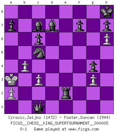 Last move : 0-1 2019 April 23 21:42:51 [Event "FICGS__CHESS__KING_SUPERTOURNAMENT__000005"] [Site "FICGS"] [Date "2019.03.01"] [Round "1"] [White "Cirovic,Zeljko"] [Black "Foster,Duncan"] [Result "0-1"] [WhiteElo "1472"] [BlackElo "1944"] 1.e4 e5 2.f4 exf4 3.Nf3 d6 4.d4 g5 5.Qe2 g4 6.Ng1 Bg7 7.Bxf4 Bxd4 8.c3 Bb6 9.Nd2 Nc6 10.O-O-O Qf6 11.g3 Nge7 12.Nc4 Ng6 13.Bxd6 cxd6 14.Nxd6+ Kf8 15.Qd2 Kg7 16.h4 Rd8 17.h5 Nge5 18.h6+ Kh8 19.Bb5 Bc7 20.Bxc6 bxc6 21.Qf4 Rxd6 22.Rxd6 Qxd6 23.Qg5 Qg6 24.Qe7 Bd7 25.Ne2 Re8 26.Qc5 Nd3+ 27.Kb1 Nxc5 28.b4 Qxe4+ 29.Ka1 Qxh1+ 30.Kb2 Rxe2+ 31.Ka3 Qc1+ 0-1 KGA : Fischer defense Queenside Castling by player White (move 10) Player Black won this chess game. Follow this game move after move (download)Of Chess it has been said that life is not long enough for it, but that is the fault of life, not Chess. (William Ewart Napier) Ich kenne Menschen, die allen Willen der Welt besitzen und doch nicht Schach spielen können. (Robert James Fischer) ¿Esta Bobby Fischer algo cuerdo?. (Salo Flohr) Comme les marins qui ont mille raisons différentes d'aller en mer, les joueurs d'échecs en ont tout autant avant de s'installer devant une table et jouer... (Vincent Bertignac, philosophe) When you have everything, sometimes it feels like nothing. (Horatio Caine, C.S.I. Miami)