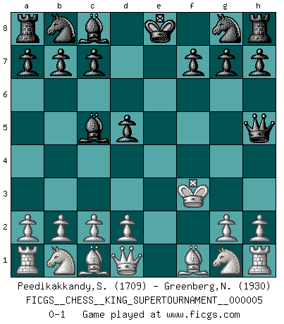 Last move : 0-1 2019 March 12 16:47:29 [Event "FICGS__CHESS__KING_SUPERTOURNAMENT__000005"] [Site "FICGS"] [Date "2019.03.01"] [Round "1"] [White "Peedikakkandy,Sameer"] [Black "Greenberg,Normund"] [Result "0-1"] [WhiteElo "1709"] [BlackElo "1930"] 1.e4 e5 2.f4 d5 3.fxe5 Qh4+ 4.Ke2 Qxe4+ 5.Kf2 Bc5+ 6.Kg3 Qxe5+ 7.Kf3 Qh5+ 0-1 KGD : Falkbeer counter-gambit Player Black won this chess game. Follow this game move after move (download)I feel as if I were a piece in a game of Chess, when my opponent says of it: That piece cannot be moved. (Soren Kierkegaard) Das Schach hält seine Meister in eigenen Banden, Fesseln; auf vielerlei Weise formt es ihren Geist, so dass die innere Freiheit selbst des Stärksten beeinflusst wird. (Albert Einstein) Un jugador que trata de regresar una movida en el Ajedrez es un futuro carterista. (Richard Fenton) Il n'y a pas de prix trop élevé au scalp de l'ennemi. (Koblentz) Art is the triumph over chaos. (John Cheever)