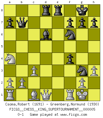 Last move : 0-1 2019 March 26 21:9:47 [Event "FICGS__CHESS__KING_SUPERTOURNAMENT__000005"] [Site "FICGS"] [Date "2019.03.01"] [Round "1"] [White "Csoma,Robert"] [Black "Greenberg,Normund"] [Result "0-1"] [WhiteElo "1691"] [BlackElo "1930"] 1.e4 e5 2.f4 d5 3.exd5 exf4 4.Nf3 c6 5.d4 Bd6 6.dxc6 Nxc6 7.Be2 Nf6 8.O-O O-O 9.Bd2 Re8 10.Nc3 Qb6 11.Bc1 Bg4 12.h3 Bxf3 13.Bxf3 Nxd4 14.Kh1 Rad8 15.Na4 Qa6 16.c3 Nf5 17.Bxb7 Ng3+ 18.Kg1 Qxb7 0-1 KGD : Falkbeer counter-gambit Kingside Castling by player White (move 8) Kingside Castling by player Black (move 8) Player Black won this chess game. Follow this game move after move (download)Discovered check is the dive bomber of the Chessboard. (Reuben Fine) Ich erzeugte keinen Neid, da mich die Schachspieler als Musiker und die Musiker als Schachspieler betrachteten. (Mark Taimanov) Todavía soy una víctima del Ajedrez. Tiene toda la belleza del arte y mucho mas. No puede ser comercializado. El Ajedrez es mas puro que el arte en su posición social. (Marcel Duchamp) Même un GMI sait rarement calculer sur plus de cinq coups une attaque à sacrifices. (Rudolf Spielmann) The worth of a book is to be measured by what you can carry away from it. (James Bryce)