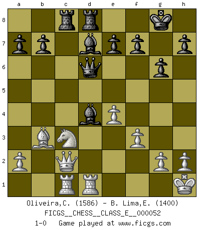 Last move : 1-0 2007 October 12 18:30:0 [Event "FICGS__CHESS__CLASS_E__000052"] [Site "FICGS"] [Date "2007.06.03"] [Round "1"] [White "Oliveira,Carlos"] [Black "B. Lima,Edmilson"] [Result "1-0"] [WhiteElo "1586"] [BlackElo "1400"] 1.d4 Nf6 2.c4 g6 3.Nc3 d5 4.cxd5 Nxd5 5.e4 Nxc3 6.bxc3 Bg7 7.Bc4 c5 8.Ne2 Nc6 9.Be3 O-O 10.O-O Qc7 11.Bb3 Rd8 12.Qc2 cxd4 13.cxd4 Qd6 14.Rfd1 Bg4 15.f3 Bd7 16.Nc3 Nxd4 17.Bxd4 Bxd4+ 18.Kh1 Rac8 19.Rac1 1-0 King's Indian defense, 3.Nc3 Kingside Castling by player Black (move 9) Kingside Castling by player White (move 10) Player White won this chess game. Follow this game move after move (download)Could we look into the head of a Chess player, we should see there a whole world of feelings, images, ideas, emotion and passion. (Alfred Binet) Die größte Kunst beim Schach besteht darin dem Gegner nicht zu zeigen was er tun kann. (Garry Kasparov) No nos podemos resistir a la fascinación de un sacrificio ya que la pasión por los sacrificios es parte de la naturaleza de un jugador de Ajedrez. (Rudolf Spielman) Même si l'adversaire joue le coup analysé précédemment, recommencez l'analyse en voyant la nouvelle position. Première règle de Blumenfeld An expert is a man who has made all the mistakes which can be made in a very narrow field. (Niels Bohr)
