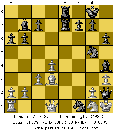 Last move : 0-1 2019 May 1 6:28:3 [Event "FICGS__CHESS__KING_SUPERTOURNAMENT__000005"] [Site "FICGS"] [Date "2019.03.01"] [Round "1"] [White "Kehayov,Yulian"] [Black "Greenberg,Normund"] [Result "0-1"] [WhiteElo "1271"] [BlackElo "1930"] 1.e4 e5 2.f4 d5 3.exd5 exf4 4.Nf3 Qxd5 5.d4 Bd6 6.Be2 Nf6 7.Nc3 Qe6 8.O-O O-O 9.Bd3 h6 10.Re1 Qd7 11.Bxf4 Bxf4 12.Ne2 Bd6 13.h3 Nc6 14.c3 b6 15.Bb5 Bb7 16.Rf1 a6 17.Bd3 Rfe8 18.Ng3 Bxg3 19.Qd2 Re7 20.Qc2 Qd6 21.Nd2 Bh2+ 22.Kh1 Rae8 23.Nf3 Bg3 24.Ng1 Nd8 25.Ne2 Bh4 26.Rg1 Nh5 27.Qd1 Ne6 28.Rf1 Ng5 29.Ng1 Ng3+ 30.Kh2 Nxf1+ 31.Kh1 Qh2+ 0-1 KGD : Falkbeer counter-gambit Kingside Castling by player White (move 8) Kingside Castling by player Black (move 8) Player Black won this chess game. Follow this game move after move (download)You sit at the board and suddenly your heart leaps. Your hand trembles to pick up the piece and move it. But what Chess teaches you is that you must sit there calmly and think about whether it's really a good idea and whether there are other better ideas. (Stanley Kubrick) Schach ist Krieg, im Schach geht es um testosterongesteuerte Urschreie. (Garry Kasparov) No puedes jugar al Ajedrez si eres de corazón noble. (Proverbio Francés) Je ne suis pas le dernier à jouer lâchement des coups douteux pendant le zeïtnot de l'adversaire pour l'achever: en effet les coups qui font le plus peur sont ceux que l'on ne comprend pas. Je me fais souvent peur quand je joue. (Un professeur anonyme) Winning isn't everything... but losing is nothing. (Mednis)