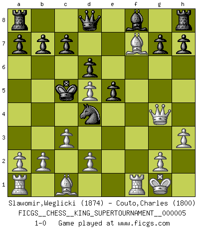 Last move : 1-0 2019 April 13 16:53:30 [Event "FICGS__CHESS__KING_SUPERTOURNAMENT__000005"] [Site "FICGS"] [Date "2019.03.01"] [Round "1"] [White "Slawomir,Weglicki"] [Black "Couto,Charles"] [Result "1-0"] [WhiteElo "1874"] [BlackElo "1800"] 1.e4 e5 2.f4 Nc6 3.Nf3 f6 4.Bc4 Nge7 5.fxe5 fxe5 6.Nc3 d6 7.O-O Bg4 8.h3 Bxf3 9.Qxf3 Nd4 10.Bf7+ Kd7 11.Qg4+ Kc6 12.Nd5 Nxd5 13.exd5+ Kc5 14.c3 1-0 This chess game has been lost on time (started : 2019.03.01 23:14:54) King's gambit Kingside Castling by player White (move 7) Player White won this chess game. Follow this game move after move (download)A passed Pawn increases in strength as the number of pieces on the board diminishes. (Capablanca) Obendrein hat der FIDE-Präsident den Revolutionsführer Gaddafi zum »Großmeister« ernannt, am Ende der WM. Das ist lächerlich! (Joel Lautier) Botvinnik trató de alejar el misterio referente al Ajedrez, siempre relacionandolo a situaciones de la vida diaria. Solía llamar al Ajedrez un problema inexacto típico, similar a aquellos en que la gente tiene siempre que resolver a cada día. (Garry Kasparov) On est toujours la mazette de quelqu'un d'autre. (Anonyme) Everything in life is luck. (Donald Trump)