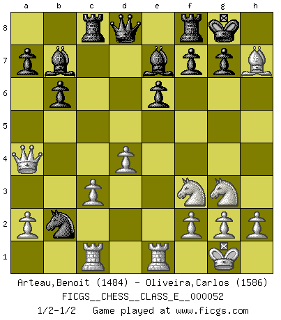 Last move : 1/2-1/2 2007 July 26 18:2:15 [Event "FICGS__CHESS__CLASS_E__000052"] [Site "FICGS"] [Date "2007.06.03"] [Round "1"] [White "Arteau,Benoit"] [Black "Oliveira,Carlos"] [Result "1/2-1/2"] [WhiteElo "1484"] [BlackElo "1586"] 1.d4 d5 2.c4 dxc4 3.e3 Nf6 4.Bxc4 e6 5.Nf3 Be7 6.Nc3 O-O 7.Bd2 c5 8.O-O Nc6 9.Ne2 b6 10.Bc3 Bb7 11.Rc1 Rc8 12.Ng3 cxd4 13.exd4 Nd5 14.Re1 Nxc3 15.bxc3 Na5 16.Bd3 Nc4 17.Qa4 Nb2 18.Bxh7+ 1/2-1/2 Queen's gambit accepted Kingside Castling by player Black (move 6) Kingside Castling by player White (move 8) This chess game ended in a draw. Follow this game move after move (download)Chess is a more highly symbolic game, but the aggressions are therefore even more frankly represented in the play. It probably began as a war game; that is, the representation of a miniature battle between the forces of two kingdoms. (Karl Meninger) Kostenjuk hat keinen Sexappeal. (Loek van Wely) El Ajedrez es realmente noventa y nueve por ciento calculación. (Soltis) Je fais ceci parce que dans cinquante coups j'obtiendrai cela; je m'appelle Mikhail Moisevitch Botvinnik. (Botvinnik) Whoever said the pen is mightier than the sword obviously never encountered automatic weapons. (US General Douglas MacArthur)