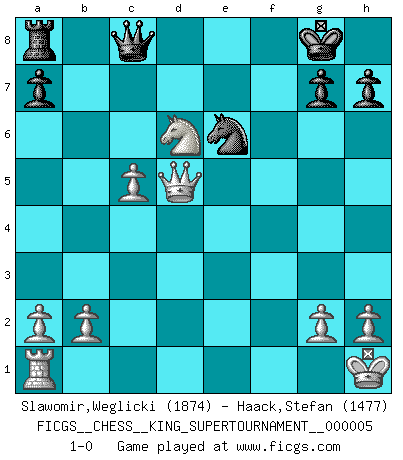 Last move : 1-0 2019 April 24 18:18:32 [Event "FICGS__CHESS__KING_SUPERTOURNAMENT__000005"] [Site "FICGS"] [Date "2019.03.01"] [Round "1"] [White "Slawomir,Weglicki"] [Black "Haack,Stefan"] [Result "1-0"] [WhiteElo "1874"] [BlackElo "1477"] 1.e4 e5 2.f4 exf4 3.Nf3 d5 4.exd5 Nf6 5.c4 c6 6.d4 cxd5 7.c5 Nc6 8.Bxf4 Bg4 9.Bb5 Be7 10.O-O O-O 11.Qa4 Qc8 12.Bxc6 bxc6 13.Ne5 Bd7 14.Nc3 Nh5 15.Nxd5 cxd5 16.Qxd7 Nxf4 17.Qxe7 Ne2+ 18.Kh1 Nxd4 19.Rxf7 Rxf7 20.Qxf7+ Kh8 21.Qxd5 Ne6 22.Nf7+ Kg8 23.Nd6 1-0 This chess game has been lost on time (started : 2019.03.01 23:14:54) KGA : Abbazia defense, Modern variation Kingside Castling by player White (move 10) Kingside Castling by player Black (move 10) Player White won this chess game. Follow this game move after move (download)Fischer is completely natural. He plays no roles. He's like a child. Very, very simple. (Zita Rajcsanyi) Schach ist eine Sache der genauen Beurteilung, wann man zuschlagen und wann man sich ducken muss. (Robert James Fischer) El Ajedrez, como la música, como el amor, tiene el poder de hacer feliz a la gente. (Siegbert Tarrasch) Karpov est une pièce de musée. (Garry Kasparov) I couldn't make any sense out of what this particular thread is about. It sounds like R2 D2 computer speaking. A space fight ?!? Some 'command' problems in Moscow ? Some killers & narcotic addicts attacking some game & a god wannabe ?? (Dinesh De Silva, lost in a russian conflict in FICGS forum)