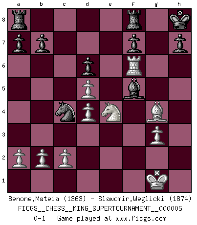 Last move : 0-1 2019 April 7 15:15:36 [Event "FICGS__CHESS__KING_SUPERTOURNAMENT__000005"] [Site "FICGS"] [Date "2019.03.01"] [Round "1"] [White "Benone,Mateia"] [Black "Slawomir,Weglicki"] [Result "0-1"] [WhiteElo "1363"] [BlackElo "1874"] 1.e4 e5 2.f4 exf4 3.Nf3 g5 4.h4 g4 5.Ne5 Nf6 6.Bc4 d5 7.exd5 Bd6 8.d4 Nh5 9.O-O O-O 10.Rxf4 Nxf4 11.Bxf4 Qxh4 12.g3 Qh5 13.Nc3 Bf5 14.Be2 Nd7 15.Nxg4 Qg6 16.Nh6+ Kh8 17.Bh5 Qf6 18.Bxd6 cxd6 19.Qd2 Bg6 20.Bg4 Nb6 21.Rf1 Nc4 22.Rxf6 Nxd2 23.Nf5 Nc4 24.Ne4 Bxf5 0-1 KGA : Kieseritsky, Berlin defense, 6.Bc4 Kingside Castling by player White (move 9) Kingside Castling by player Black (move 9) Player Black won this chess game. Follow this game move after move (download)The boy (then a 12 year old boy named Anatoly Karpov) doesn't have a clue about Chess, and there's no future at all for him in this profession. (Mikhail Botvinnik) Das Schachspiel hat wie die Liebe, die Musik, die Fähigkeit, den Menschen glücklich zu machen. Ich habe ein leises Gefühl des Bedauerns für jeden, der das Schachspiel nicht kennt, so wie ich jeden bedaure, der die Liebe nicht kennt. (Siegbert Tarrasch) ¿Quién es tu oponente esta tarde? Esta tarde mi oponente son las piezas negras. (Akiba Rubinstein) Même un GMI sait rarement calculer sur plus de cinq coups une attaque à sacrifices. (Rudolf Spielmann) There is a great deal of difference between an eager man who wants to read a book and a tired man who wants a book to read. (G.K. Chesterton)
