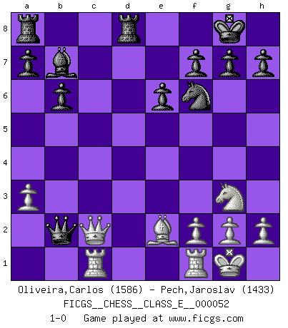 Last move : 1-0 2007 October 23 1:24:0 [Event "FICGS__CHESS__CLASS_E__000052"] [Site "FICGS"] [Date "2007.06.03"] [Round "1"] [White "Oliveira,Carlos"] [Black "Pech,Jaroslav"] [Result "1-0"] [WhiteElo "1586"] [BlackElo "1433"] 1.d4 Nf6 2.c4 e6 3.Nc3 Bb4 4.e3 O-O 5.Bd3 d5 6.Nge2 c5 7.cxd5 cxd4 8.exd4 Nxd5 9.O-O Nc6 10.Bd2 Nf6 11.a3 Bd6 12.Rc1 b6 13.Nb5 Bb7 14.Nxd6 Qxd6 15.Bc3 Rfd8 16.Ng3 Nxd4 17.Bxd4 Qxd4 18.Be2 Qxb2 19.Qc2 1-0 This chess game has been lost on time (started : 2007.06.03 15:42:46) Nimzo-Indian : 4.e3 O-O, 5.Bd3 d5 Kingside Castling by player Black (move 4) Kingside Castling by player White (move 9) Player White won this chess game. Follow this game move after move (download)Chess is everything: art, science and sport. (Anatoly Karpov) Wenn ich Weiß habe gewinne ich weil ich Weiß habe, wenn ich Schwarz habe gewinne ich weil ich Bogoljubov bin. (Efim Bogoljubov) Fischer sacrificó virtualmente todo lo que la mayoría de nosotros los 'debiles' (término que él usa) valoramos, respetamos y apreciamos por el amor de un astuto, a menudo hermoso tablero de juego, por el privilegio ambivalente de ser su mas grande maestro. (Paul Kollar) Nous sommes les pions de la mystérieuse partie d'Echecs jouée par Dieu. Il nous déplace, nous arrête, nous pousse encore, puis nous lance un à un dans la boîte du Néant. Epitaphe sur la tombe de David Janowsky (1868-1927). To err is human, but to really foul things up requires a computer. (Farmer's Almanac, 1978)