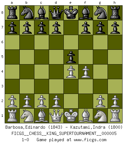 Last move : 1-0 2019 April 1 2:23:35 [Event "FICGS__CHESS__KING_SUPERTOURNAMENT__000005"] [Site "FICGS"] [Date "2019.03.01"] [Round "1"] [White "Barbosa,Edinardo"] [Black "Kazutami,Indra"] [Result "1-0"] [WhiteElo "1843"] [BlackElo "1800"] 1.e4 e5 2.f4 1-0 This chess game has been lost on time (started : 2019.03.01 23:14:54) King's gambit Player White won this chess game. Follow this game move after move (download)Spassky will not be psyched out by Fischer. (Mike Goodall) Wer sich die Fähigkeit anerziehen will im Schach selbstständig zu denken, der muß alles meiden, was leblos ist: ausgeklügelte Theorien, die sich auf sehr wenige Beispiele und eine Menge Hirngespinste stützen. (Emanuel Lasker) Los asuntos humanos son como una partida de Ajedrez: solo aquellos que no lo toman seriamente, pueden ser llamados buenos jugadores. (Hung Tzu Ch'eng) A chaque perte on perd un peu de soi. (Joël Lautier) Mandala - that's it! 16x16 squares as multiple of the four and the eight because of the Four Noble Truths and the Noble Eightfold Path. (Heinz-Georg Lehnhoff about Big Chess)