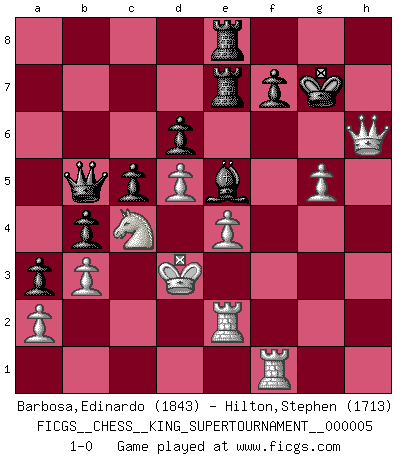 Last move : 1-0 2019 March 30 14:14:45 [Event "FICGS__CHESS__KING_SUPERTOURNAMENT__000005"] [Site "FICGS"] [Date "2019.03.01"] [Round "1"] [White "Barbosa,Edinardo"] [Black "Hilton,Stephen"] [Result "1-0"] [WhiteElo "1843"] [BlackElo "1713"] 1.e4 e5 2.f4 exf4 3.Nf3 d6 4.Bc4 h6 5.h4 Be6 6.Na3 Nf6 7.d3 Bxc4 8.Nxc4 b5 9.Ncd2 Be7 10.Nb3 Nc6 11.Bxf4 O-O 12.Qd2 Ng4 13.O-O-O Nce5 14.Nfd4 a6 15.Bxe5 Nxe5 16.Nf5 Bf6 17.Qf4 Ng6 18.Qg3 Be5 19.Qg4 Qf6 20.d4 Bf4+ 21.Kb1 h5 22.Qxh5 Ne7 23.Nxe7+ Qxe7 24.Qf3 Bh6 25.g4 g6 26.g5 Bg7 27.Rde1 a5 28.c3 c5 29.d5 a4 30.Nd2 b4 31.Kc2 a3 32.b3 Bxc3 33.Re3 Bd4 34.Rd3 Rfc8 35.Nc4 Re8 36.Rf1 Ra7 37.Nd2 Bg7 38.Re3 Rc7 39.Nc4 Qd7 40.Re2 Qd8 41.Kd3 Rce7 42.Qf4 Be5 43.Qf3 Bg7 44.Qf4 Be5 45.Qf3 Qa8 46.Nb6 Qa6+ 47.Nc4 Qb5 48.h5 gxh5 49.Qxh5 Kg7 50.Qh6+ 1-0 KGA : Fischer defense Kingside Castling by player Black (move 11) Queenside Castling by player White (move 13) Player White won this chess game. Follow this game move after move (download)The tactician must know what to do whenever something needs doing; the strategist must know what to do when nothing needs doing. (Savielly Tartakover) Sie führen leise Selbstgespräche, schlürfen lautstark ihre Getränke, schmatzen hörbar beim Essen, blasen ihrem Gegenüber Rauch in die Augen, niesen ihm ins Gesicht, starren ihn unverwandt an, bis er sich unter ihren Blicken windet, rutschen ständig auf ihrem Stuhl hin und her, rülpsen und bohren in der Nase. (Anonymous) Botvinnik trató de alejar el misterio referente al Ajedrez, siempre relacionandolo a situaciones de la vida diaria. Solía llamar al Ajedrez un problema inexacto típico, similar a aquellos en que la gente tiene siempre que resolver a cada día. (Garry Kasparov) Soyez une menace à chaque fois que vous vous asseyez pour jouer. (Ken Smith) Memory is a crazy woman that hoards colored rags and throws away food. (Austin O'Malley)