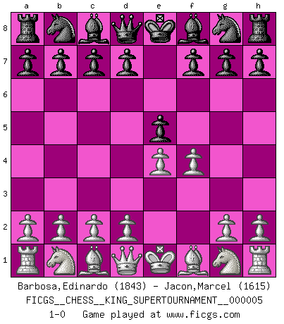 Last move : 1-0 2019 April 1 2:23:35 [Event "FICGS__CHESS__KING_SUPERTOURNAMENT__000005"] [Site "FICGS"] [Date "2019.03.01"] [Round "1"] [White "Barbosa,Edinardo"] [Black "Jacon,Marcel"] [Result "1-0"] [WhiteElo "1843"] [BlackElo "1615"] 1.e4 e5 2.f4 1-0 This chess game has been lost on time (started : 2019.03.01 23:14:54) King's gambit Player White won this chess game. Follow this game move after move (download)I'd rather have a Pawn than a finger. (Reuben Fine) Wenn Spassky eine Figur opfert kannst du genauso gut aufgeben. Aber wenn Tal eine Figur opfert, spiel weiter. Er könnte noch eine weitere opfern, und dann ... wer weiß? (Miguel Najdorf) Yo tuve un dolor de muelas en la primer partida. En el segundo juego, tuve un dolor de cabeza. En el tercero, tuve un ataque de reumatísmo. En la cuarta partida, no me sentía muy bien. ¿Y en el quinto juego? Bueno, ¿que acaso uno tiene que ganar todos los juegos?. (Siegbert Tarrasch) L'attaque fait le spectacle, la défense gagne les matchs. (Dicton footballistique) It is not true that people stop pursuing dreams because they grow old, they grow old because they stop pursuing dreams. (Gabriel Garcia Marquez)