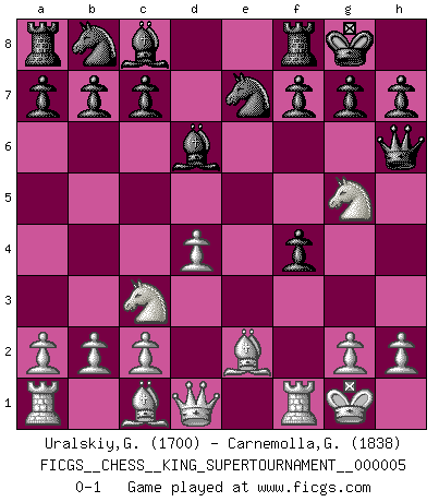 Last move : 0-1 2019 April 14 4:54:7 [Event "FICGS__CHESS__KING_SUPERTOURNAMENT__000005"] [Site "FICGS"] [Date "2019.03.01"] [Round "1"] [White "Uralskiy,Georgiy"] [Black "Carnemolla,Giampaolo"] [Result "0-1"] [WhiteElo "1700"] [BlackElo "1838"] 1.e4 e5 2.f4 exf4 3.Nf3 d5 4.exd5 Qxd5 5.Nc3 Qe6+ 6.Be2 Bd6 7.O-O Ne7 8.d4 O-O 9.Ng5 Qh6 0-1 This chess game has been lost on time (started : 2019.03.01 23:14:54) KGA : Abbazia defense (Classical defense, Modern defense!) Kingside Castling by player White (move 7) Kingside Castling by player Black (move 8) Player Black won this chess game. Follow this game move after move (download)I have always a slight feeling of pity for the man who has no knowledge of Chess. (Siegbert Tarrasch) Besser ein falscher Plan, logisch durchgeführt, als gar kein Plan. (Viktor Kortschnoi) Dios mío, Bobby Fischer juega tan simple. (Alexei Suetin) Il (Jacob Murray) ne joue pas pour le bon coup, mais pour le meilleur. (Eloi Relange) Men never do evil so completely and cheerfully as when they do it from religious conviction. (Blaise Pascal)