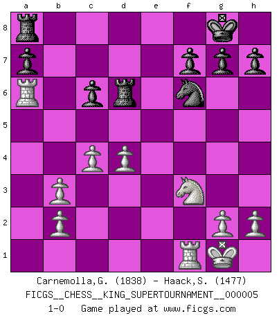 Last move : 1-0 2019 April 24 18:18:32 [Event "FICGS__CHESS__KING_SUPERTOURNAMENT__000005"] [Site "FICGS"] [Date "2019.03.01"] [Round "1"] [White "Carnemolla,Giampaolo"] [Black "Haack,Stefan"] [Result "1-0"] [WhiteElo "1838"] [BlackElo "1477"] 1.e4 e5 2.f4 exf4 3.Nf3 d5 4.exd5 Nf6 5.Bb5+ c6 6.dxc6 Nxc6 7.d4 Bg4 8.Bxf4 Be7 9.O-O O-O 10.Bxc6 bxc6 11.c4 Qb6 12.Qb3 Qxb3 13.axb3 Rfd8 14.Nbd2 Bd6 15.Bxd6 Rxd6 16.Ra6 Bxf3 17.Nxf3 1-0 This chess game has been lost on time (started : 2019.03.01 23:14:54) KGA : Abbazia defense, Modern variation Kingside Castling by player White (move 9) Kingside Castling by player Black (move 9) Player White won this chess game. Follow this game move after move (download)All I want to do, ever, is just play Chess. (Bobby Fischer) Wie, soll nun auch die Opposition abgeschafft werden? Ja, es tut mir leid, Ihnen diesen Schmerz nicht ersparen zu können. (Aaron Nimzowitsch) Cuando tu casa esta en llamas, no puedes ser molestado por tus vecinos. O, como decinos en Ajedrez, si tu Rey esta bajo ataque, no te preocupa perder un Peón del lado de la Reina. (Gary Kasparov) J'ai vu le vaincu d'Echecs jouer des années durant dans l'espoir de la fête de la victoire. Car tu es plus riche de ce qu'elle existe si même elle n'est point pour toi. Ainsi de la perle du fond des mers. (Antoine de Saint-Exupéry) Humor is by far the most significant activity of the human brain. (Edward De Bono)