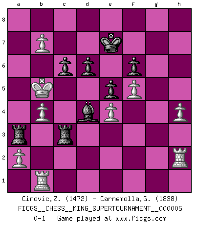 Last move : 0-1 2019 April 10 17:1:23 [Event "FICGS__CHESS__KING_SUPERTOURNAMENT__000005"] [Site "FICGS"] [Date "2019.03.01"] [Round "1"] [White "Cirovic,Zeljko"] [Black "Carnemolla,Giampaolo"] [Result "0-1"] [WhiteElo "1472"] [BlackElo "1838"] 1.e4 e5 2.f4 Bc5 3.Nf3 d6 4.f5 Nf6 5.d3 Ng4 6.Nd4 h5 7.Be2 Bxd4 8.Bxg4 hxg4 9.Qxg4 Qh4+ 10.Qxh4 Rxh4 11.c3 Bb6 12.g3 Rh8 13.Na3 Nd7 14.Bg5 f6 15.Bd2 Nc5 16.Ke2 Bd7 17.Nc4 Ke7 18.b4 Na4 19.h4 Bb5 20.g4 Bxc4 21.dxc4 a5 22.g5 axb4 23.cxb4 Bd4 24.gxf6+ gxf6 25.Rab1 Nc3+ 26.Bxc3 Bxc3 27.Kd3 Bd4 28.Rh2 Rhg8 29.c5 Rg3+ 30.Kc4 Rc3+ 31.Kb5 Ra6 32.c6 R6a3 33.cxb7 c6+ 0-1 KGD : Classical variation Player Black won this chess game. Follow this game move after move (download)Chess is war over the board. The object is to crush the opponents mind. (Bobby Fischer) Ohne Leiden bildet sich kein Charakter. (Ernst Freiherr von Feuchtersleben) El estómago es una parte esencial del maestro de Ajedrez. (Bent Larsen) On a dit que l'homme se distingue de l'animal par le fait qu'il achète plus de livres qu'il ne peut en lire. Je voudrais suggérer qu'inclure à la liste des livres quelques livres d'échecs rendrait la distinction manifeste. (Edward Lasker) The only difference between a tax man and a taxidermist is that the taxidermist leaves the skin. (Mark Twain)