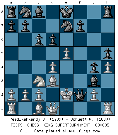 Last move : 0-1 2019 April 10 12:24:22 [Event "FICGS__CHESS__KING_SUPERTOURNAMENT__000005"] [Site "FICGS"] [Date "2019.03.01"] [Round "1"] [White "Peedikakkandy,Sameer"] [Black "Schuett,Wilhelm"] [Result "0-1"] [WhiteElo "1709"] [BlackElo "1800"] 1.e4 e5 2.f4 exf4 3.Nf3 d6 4.d4 g5 5.h4 g4 6.Ng1 Qf6 7.Nc3 c6 8.Be2 h5 9.Bd3 Bh6 10.Nge2 Ne7 11.Nxf4 Bxf4 12.e5 Bg3+ 13.Ke2 Qf2+ 0-1 KGA : Fischer defense Player Black won this chess game. Follow this game move after move (download)Suddenly it was obvious to me in my analysis I had missed what Fischer had found with the greatest of ease at the board. (Mikhail Botvinnik) Es hat in meinem Leben Zeiten gegeben, in denen das Schachspiel, wenn nicht zum Lebenszweck, so doch zu einem regelrechten Lebensersatz geworden ist. Man fühlt sich in solchen Zeiten nicht so, als besäße man eine göttliche Gabe, sondern eher so, als sei man von ihr besessen. (Garry Kasparov) Una victoria por una combinación errónea, aunque sea espectacular, me llena de horror artístico. (Wilhelm Steinitz) Dieu déplace le joueur, et celui-ci la pièce. Quel Dieu derrière Dieu commence donc la trame ? Arturo Perez-Reverte (prix de littérature policière 1993). A person who never made a mistake never tried anything new. (Albert Einstein)